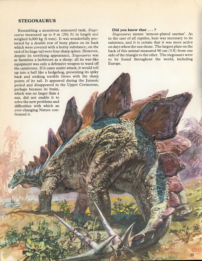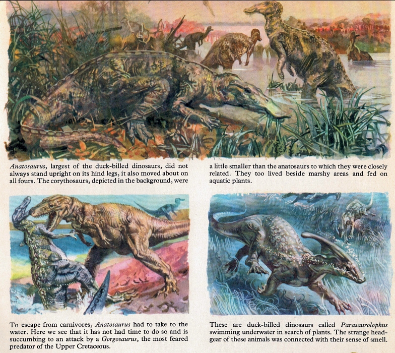 Now this is more like it! The style here is wonderful, like Burian, but gnarlier (this seems quite likely to be the same artist as with the Stegosaurus fight scene). No attempt is made at strict 'realism' with the colours here - it's all about imbuing a suitably primordial atmosphere, lending an otherwise quite tranquil scene a strange, almost eerie quality. It's an approach that a lot of today's palaeoartists could learn something from.