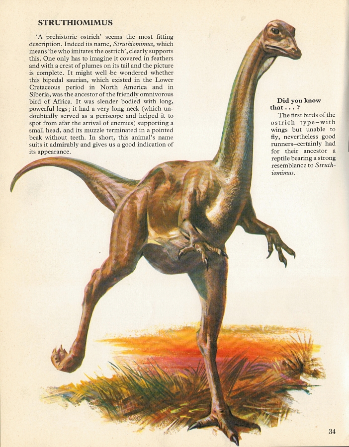 Struthiomimus! Again, this isn't bad for the time; the artist has taken care to avoid giving the animal disproportionate limbs, tiny Trumpian hands, or a chicken beak. They forgot to draw in the basketball it's dribbling, but other than that, it's a decent effort. Once again, though, the 'behaviour' illustrations are much more entertaining.
