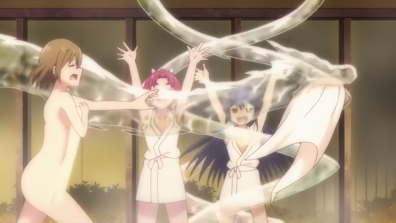 入浴中、湯浴着を剥ぎ取られて全裸にされる女子たち。