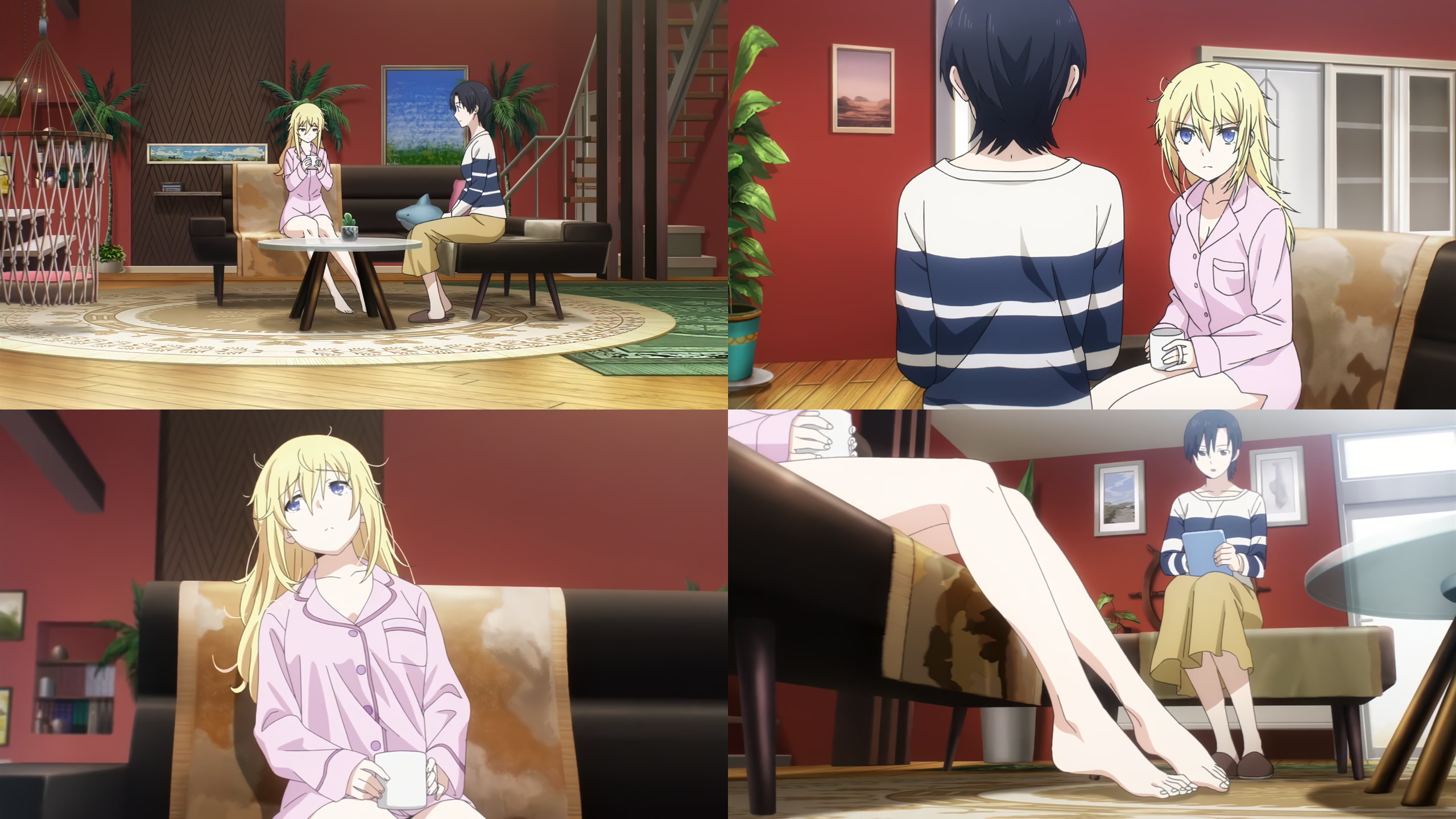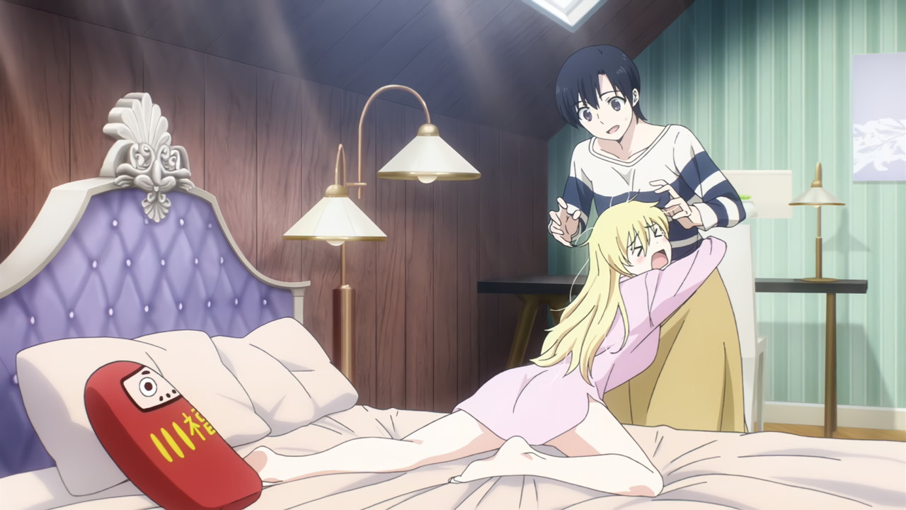 パジャマ上だけ・ズボン穿いていないリーナ。生脚がエロい。