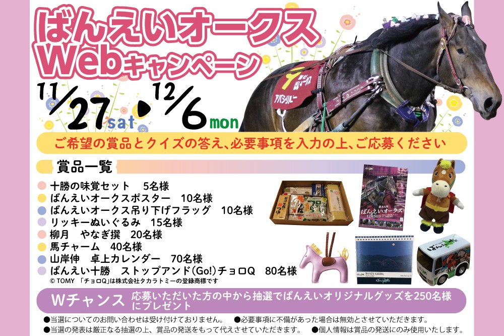 抽選で250名様に十勝の味覚セット、ばんえいオリジナルグッズなどが当たります。