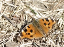 チョウが成虫の姿で冬を越す姿はなかなか想像しにくいが、彼らは草やぶの中や木々の洞などで冬を過ごす。冷たい風が吹きすさぶ初冬に、枯れ木の内部にできた洞の中で越冬しているキタテハを発見したことがあった。羽の表側はだいだい色でそれなりに鮮やかなのだが、閉じあわせると見事な保護色で、枯れ木や枯れ草に溶け込んでしまう。