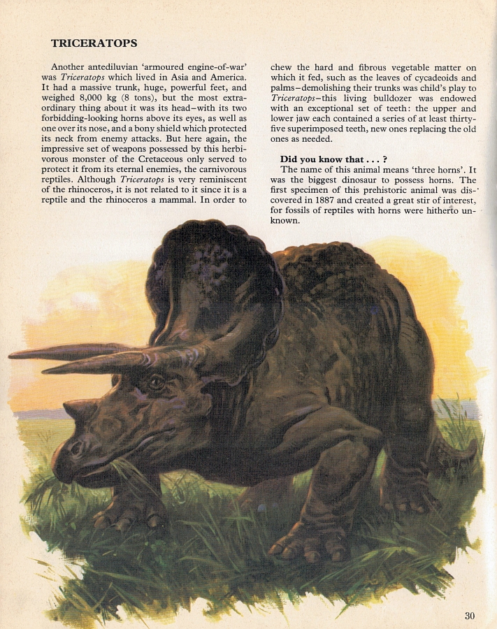 Oh boy. Here we go. Rexy had yet to go through his first 'timid scavenger' phase when this book was written, and so he's naturally described as the most terrifying juggernaut of a beast the Earth has ever seen. The "most bloodthirsty predator ever to exist," "every living being would have fled," "no creature could have offered any resistance to it except perhaps Triceratops" - you get the picture. My particular favourite line here is