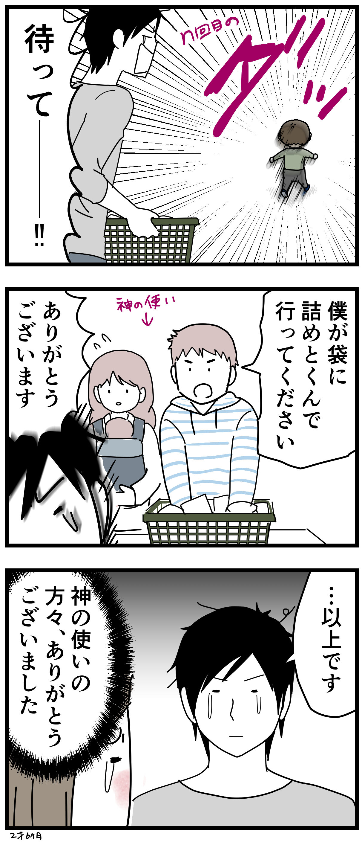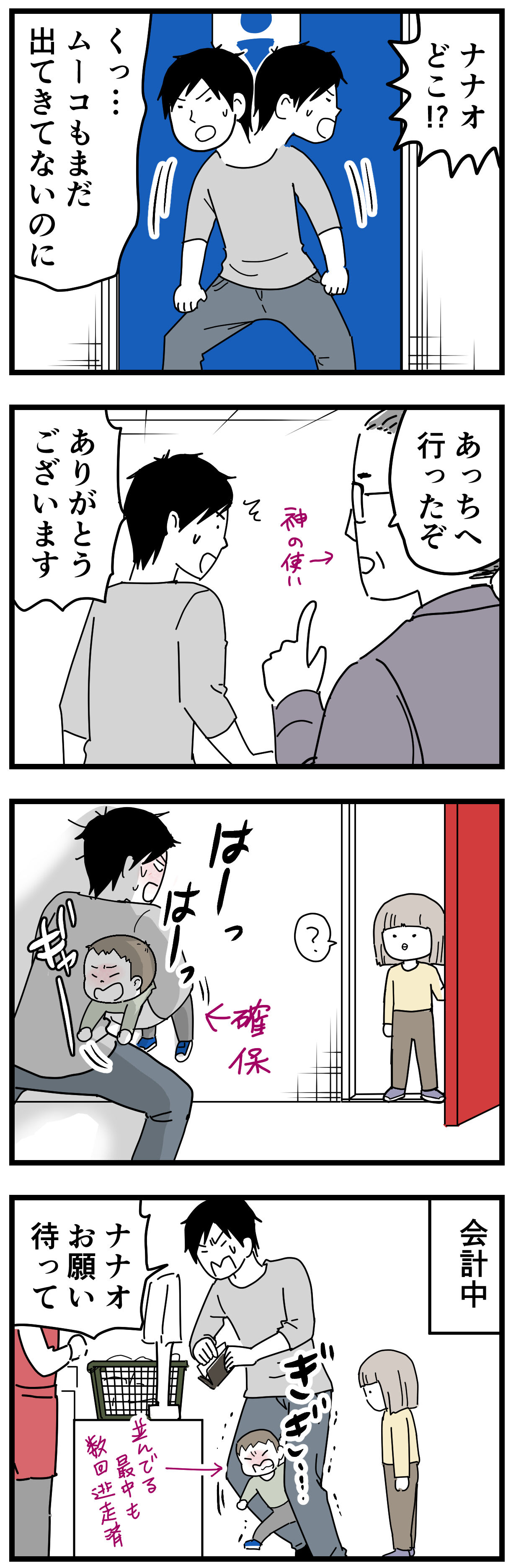 そして、その後も何度も逃走と確保を繰り返しつつ、お会計が済んであとは袋詰めだけ!という所でまたしても逃走するナナオ。