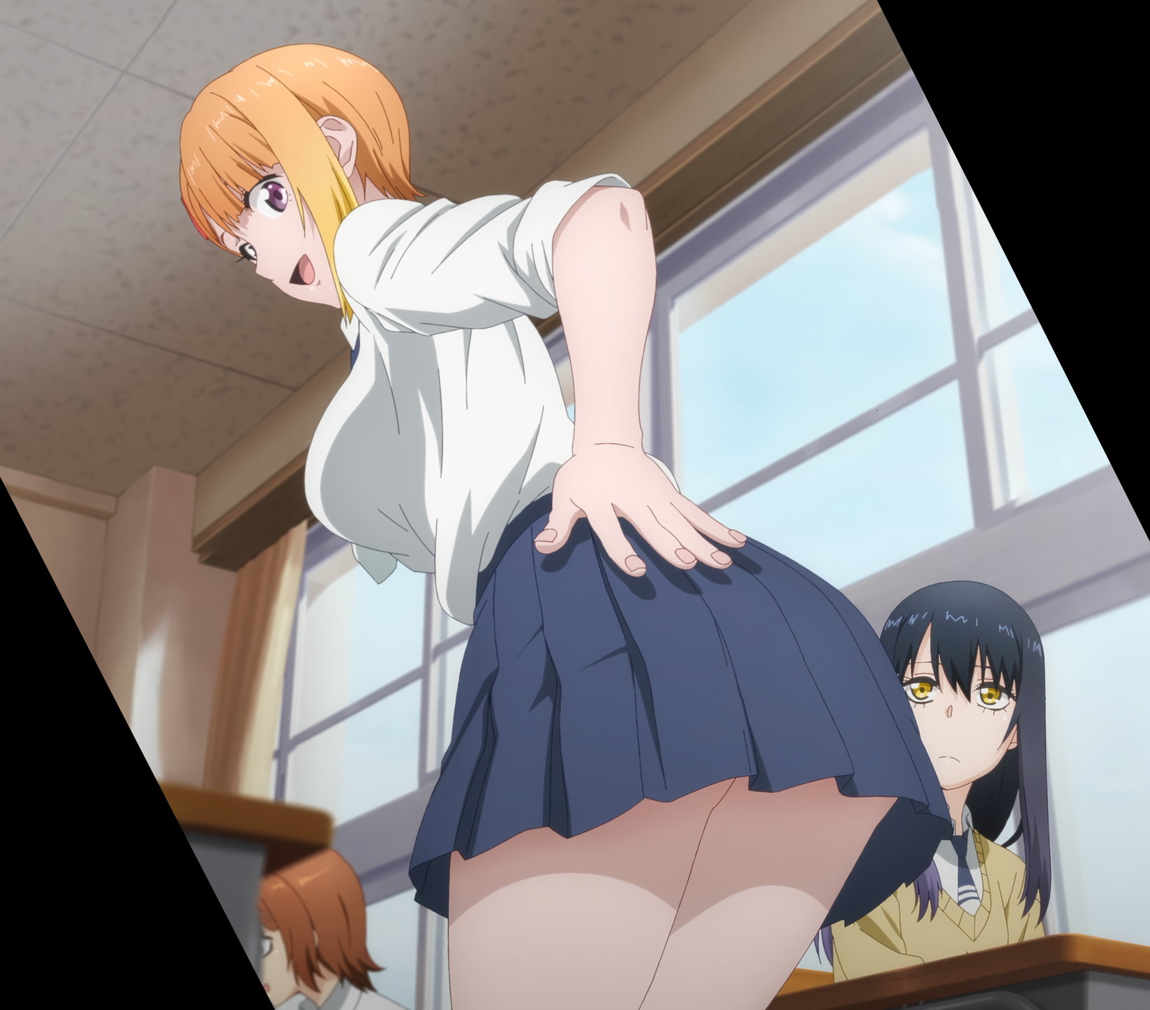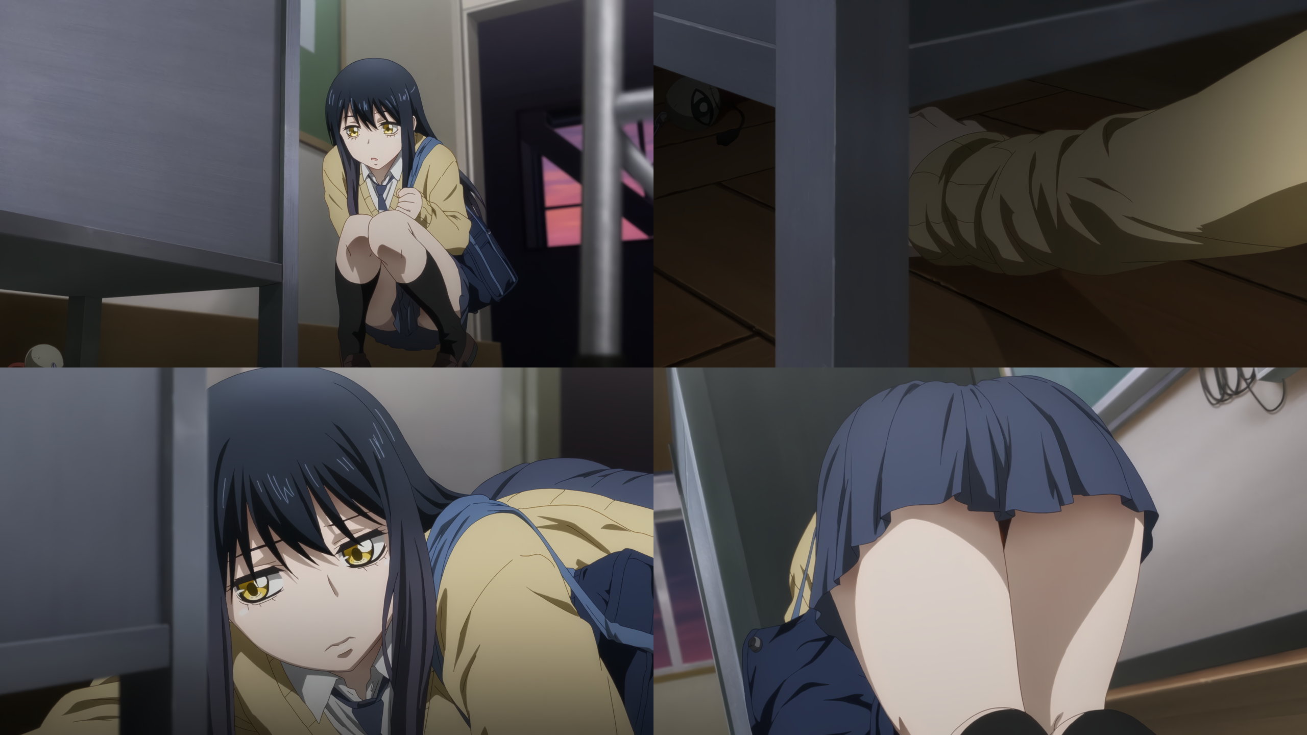 制服スカート尻を見せながら、教卓の下を探るみこ。