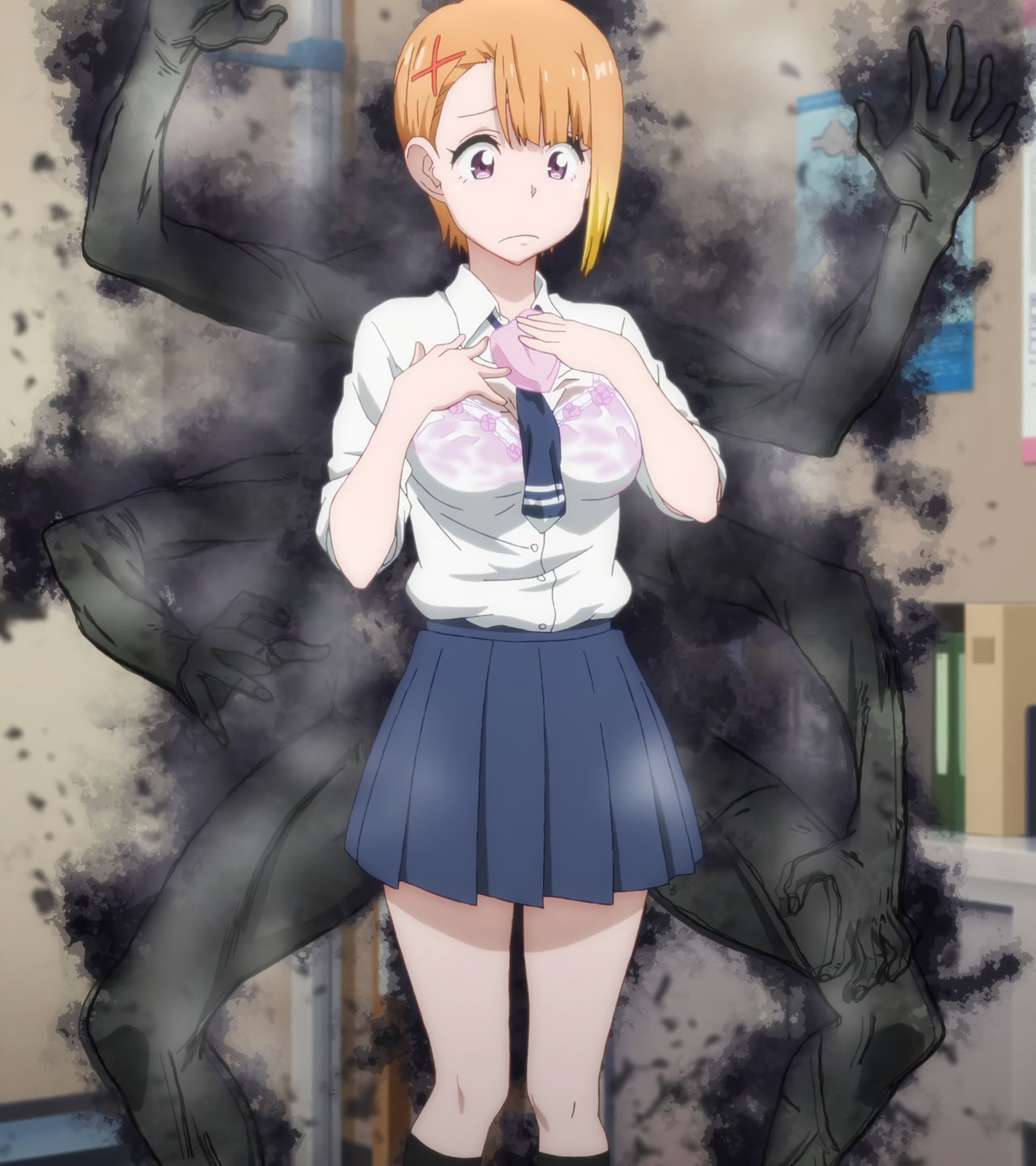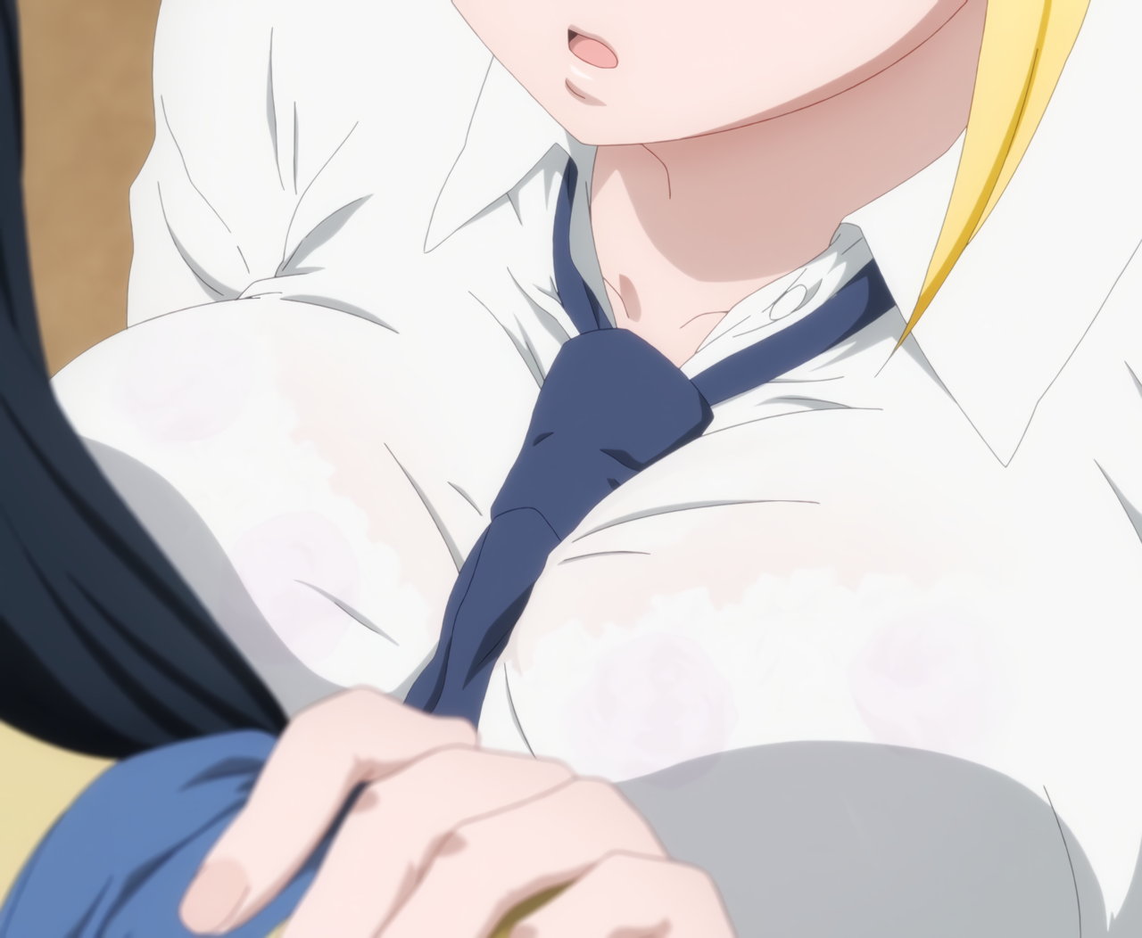 ワイシャツが濡れて透けブラするハナ。