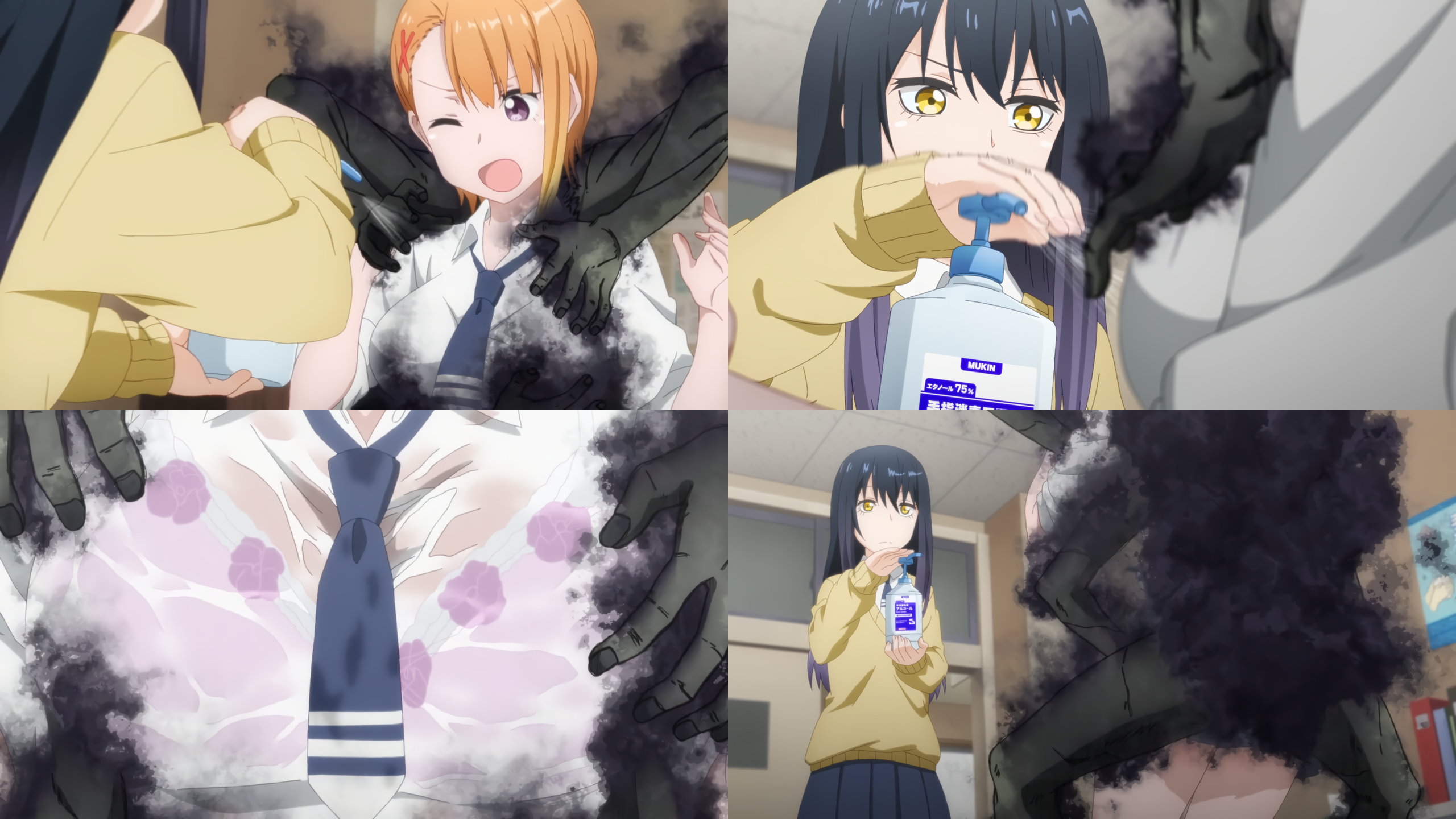 消毒液をぶっ掛けられるハナ。