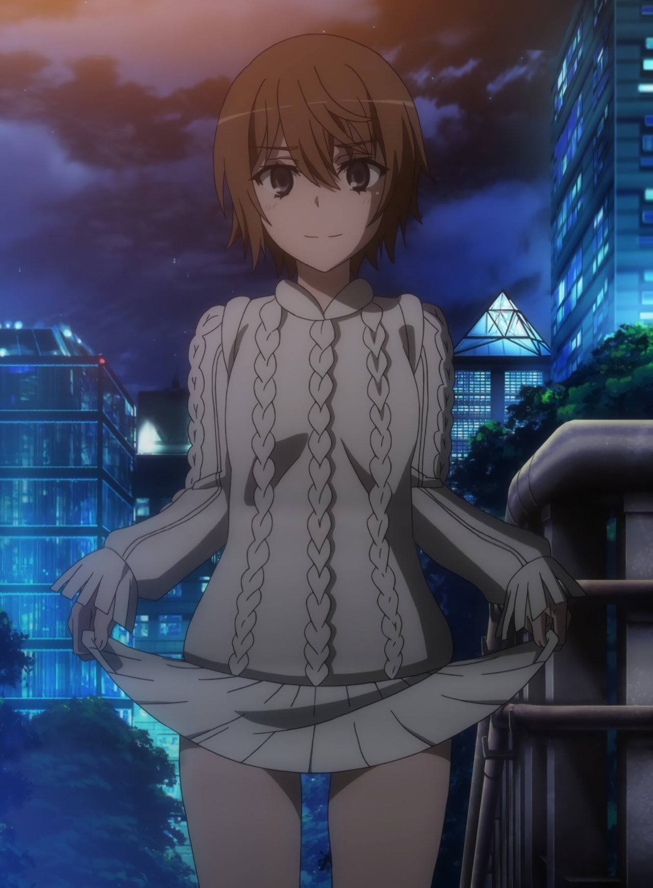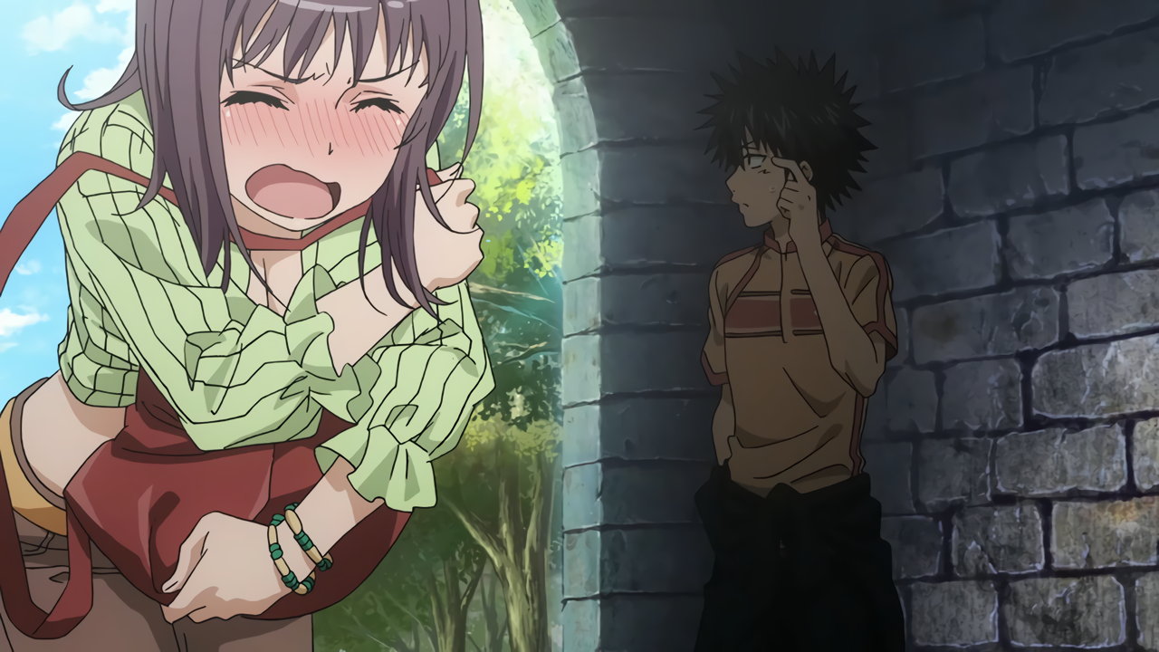 浜面仕上の前で、服が捲れそうになる絹旗最愛。慌てて裾を押さえ、パンチラを阻止する。