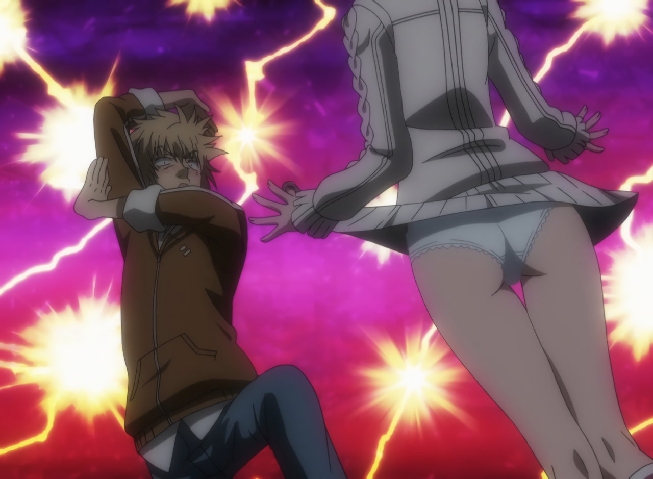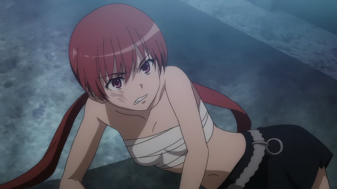 ブレザーを脱ぎ捨て、上半身晒姿で戦う結標淡希。
