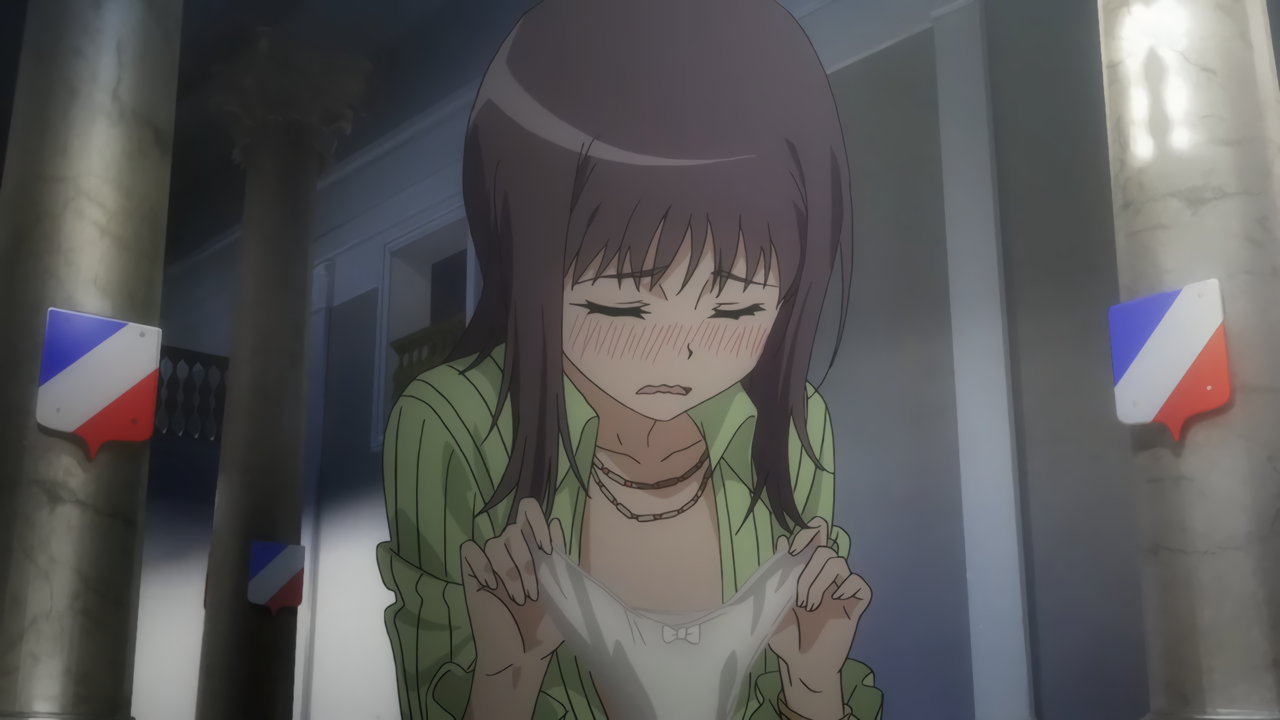 珈琲を零してしまい、服を拭こうとする親船素甘。スカートを捲る様子を、当麻に目撃される。