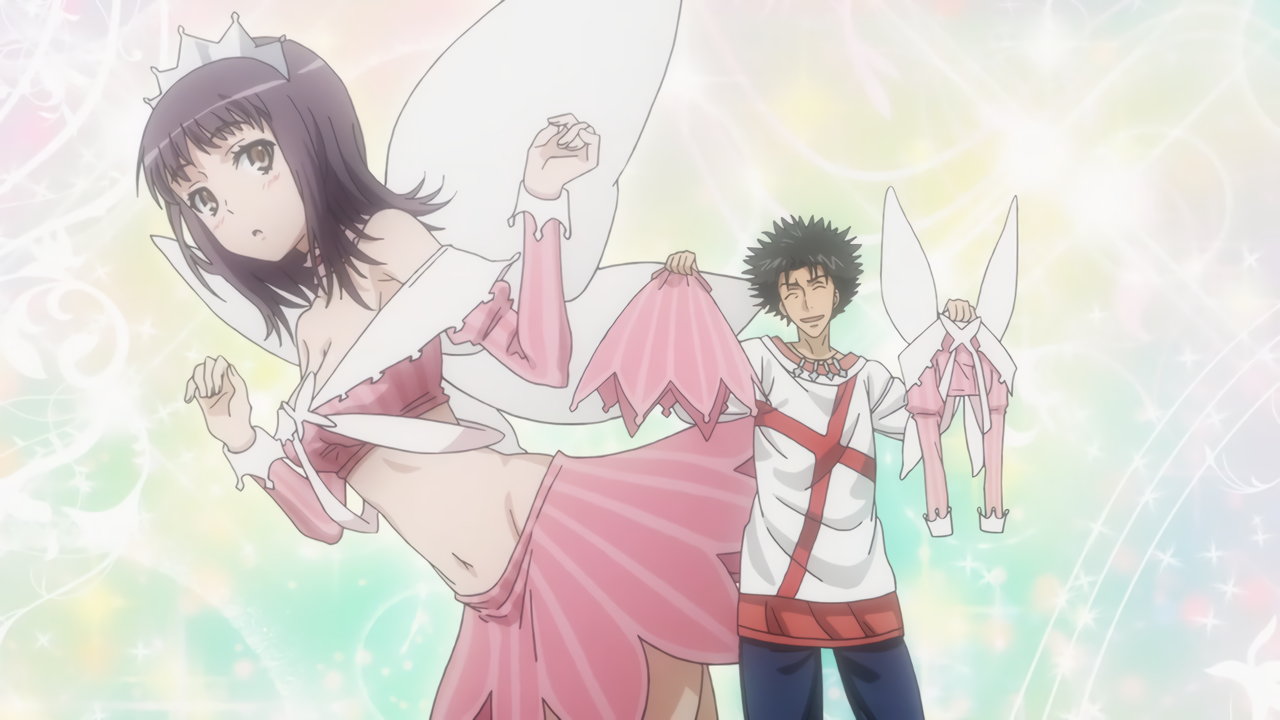 フォークボールを投げようとする吹寄制理。しかし投球の際、当麻にパンツを見られてしまう。