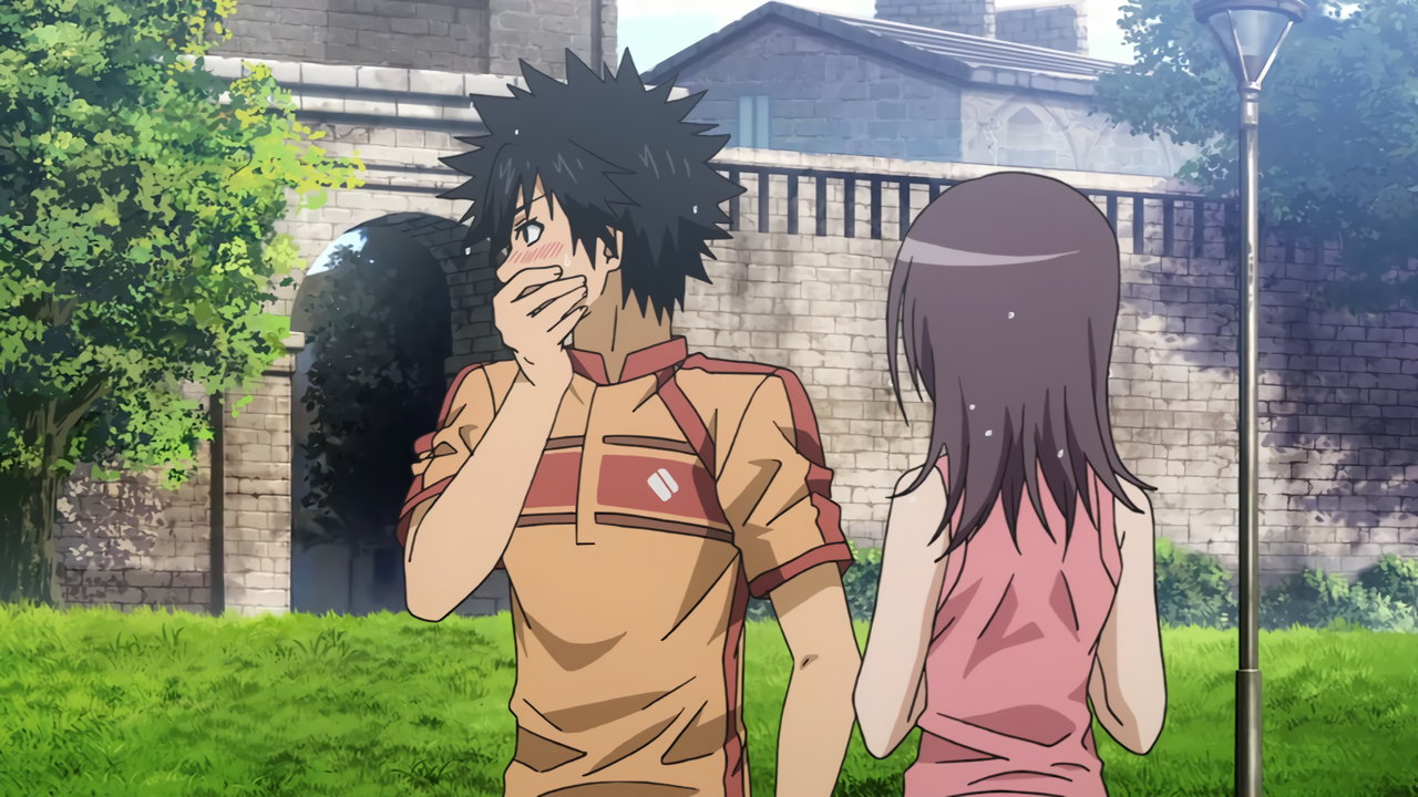後頭部にサッカーボールが直撃する当麻。その弾みで、五和の胸に顔を突っ込む。