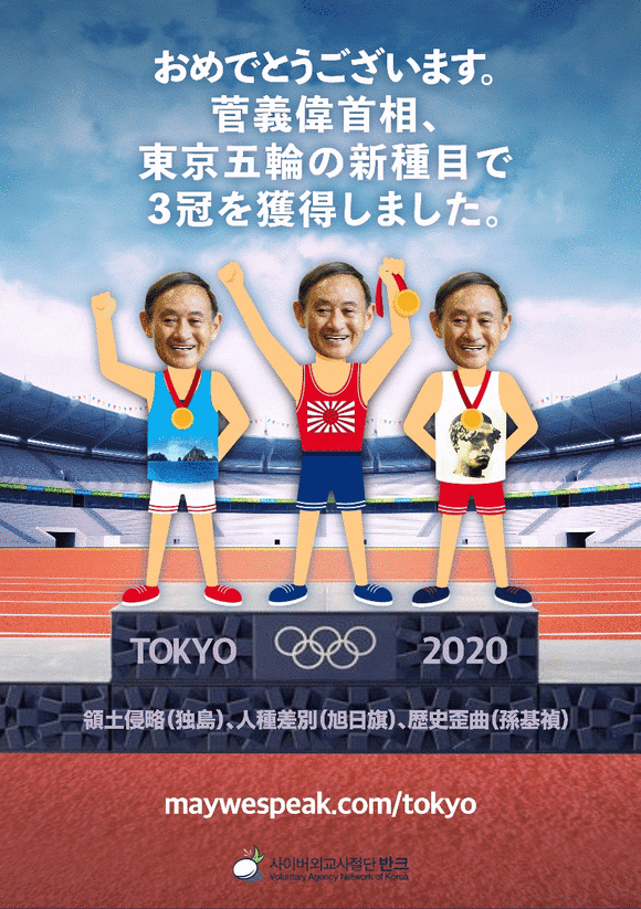 VANK「菅首相、東京五輪新種目三冠おめでとう」…オリンピックを政治利用する日本政府を批判するポスター配布=韓国の反応