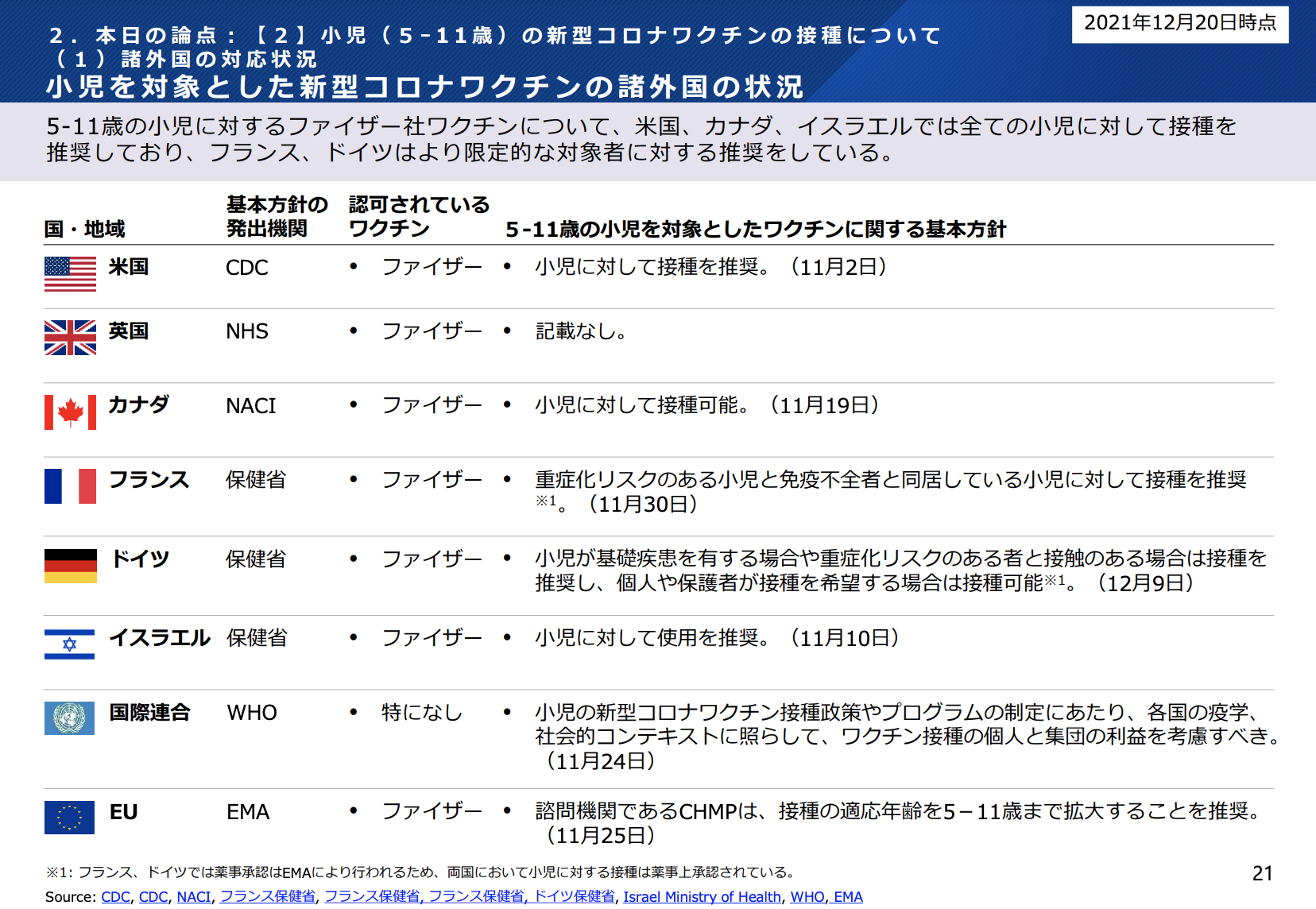 5〜11歳のファイザー社製ワクチンに対する海外の推奨状況(2021年12月20日現在)