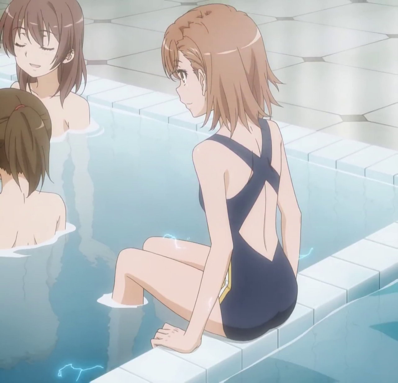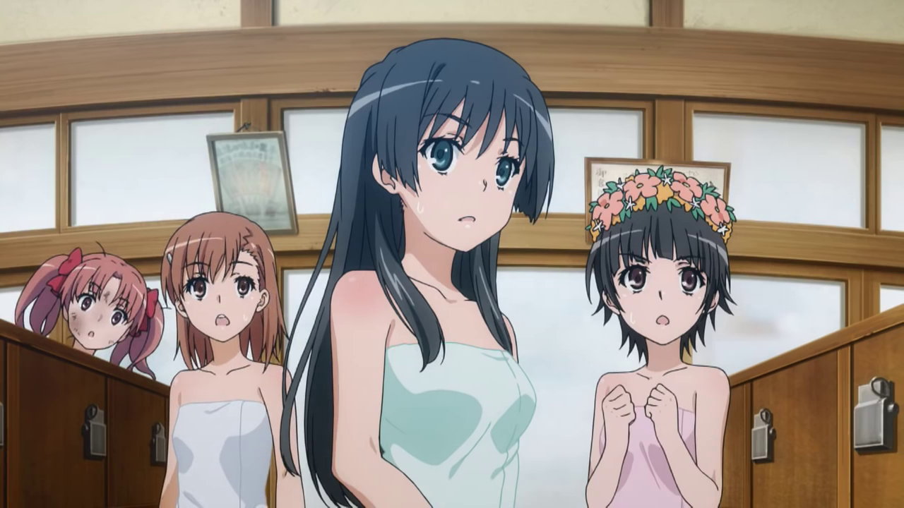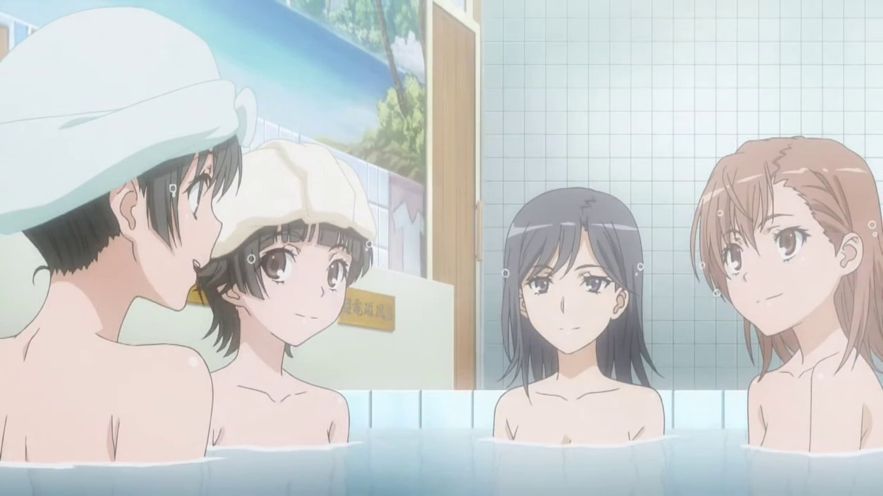 黒子を放置して湯船に浸かる、涙子、飾利、美偉、美琴。