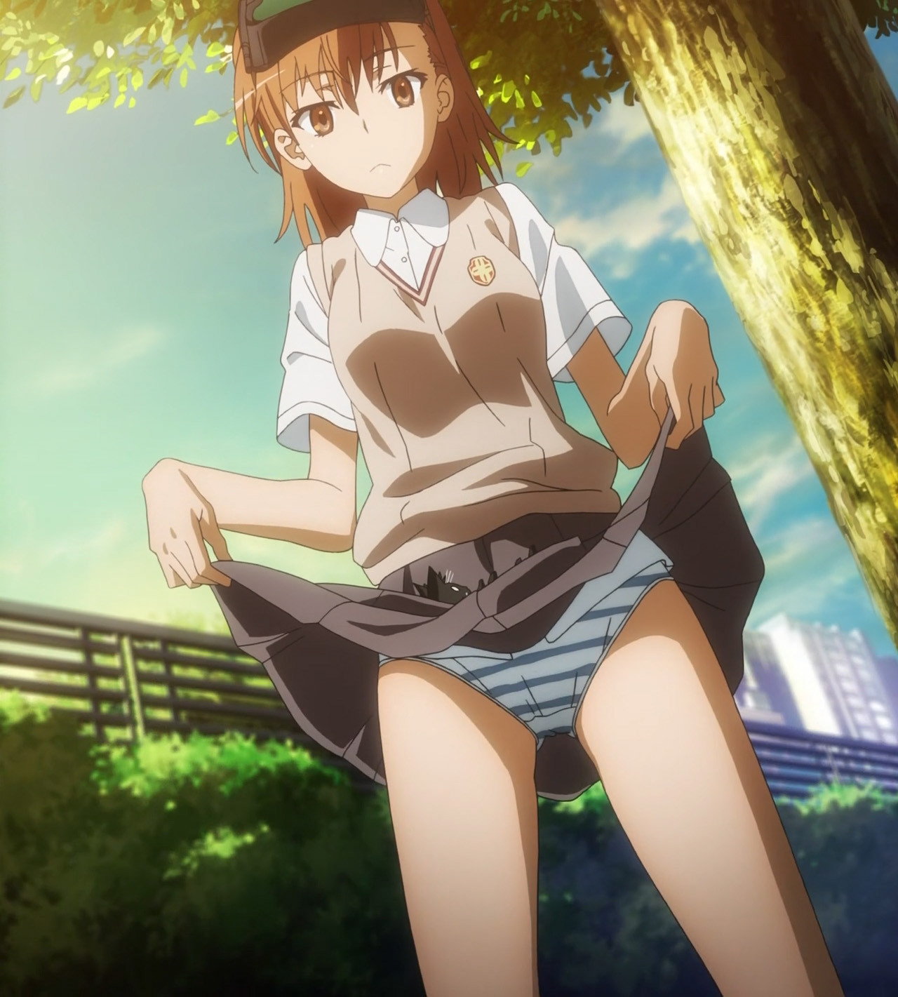 木から落ちた猫を受け止めるため、スカートを捲り上げるミサカ9982号。