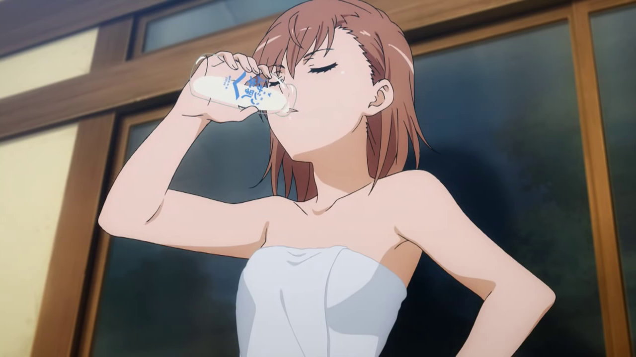 牛乳を飲んでいる途中、バスタオルが解け、おっぱい丸見えになる美偉。