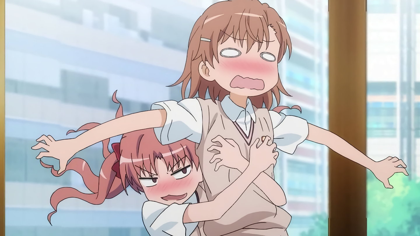 黒子に抱きつかれて赤面する美琴。