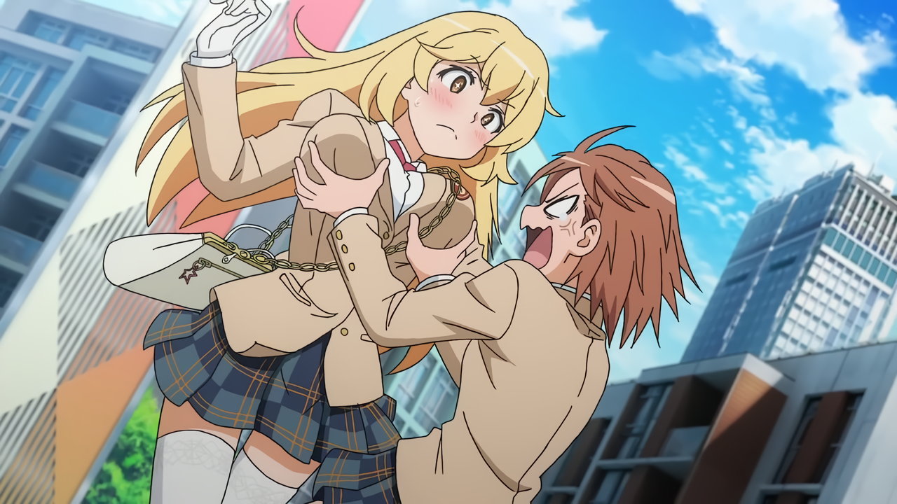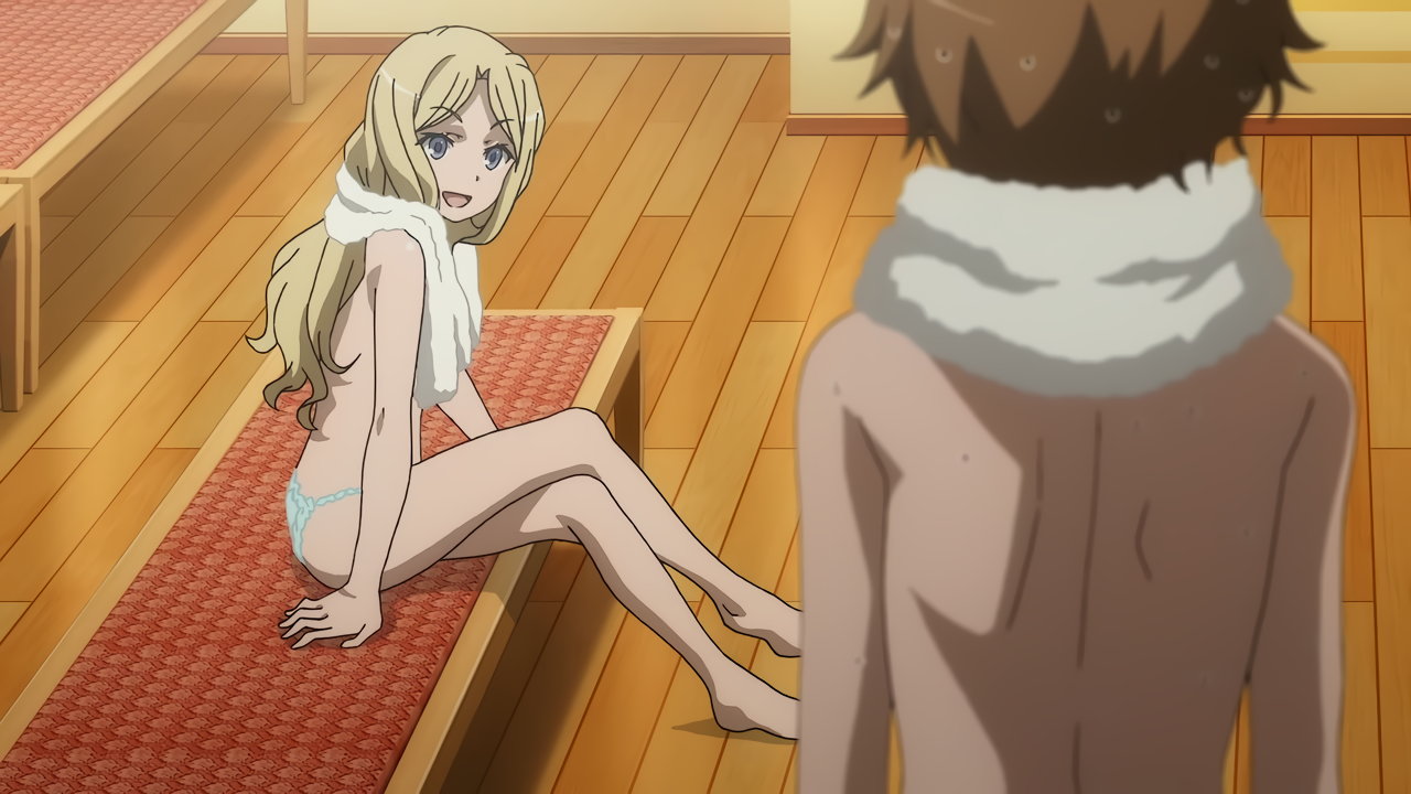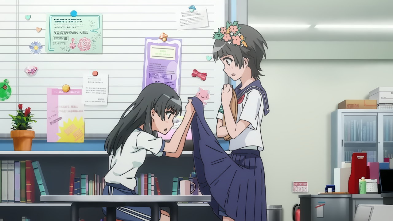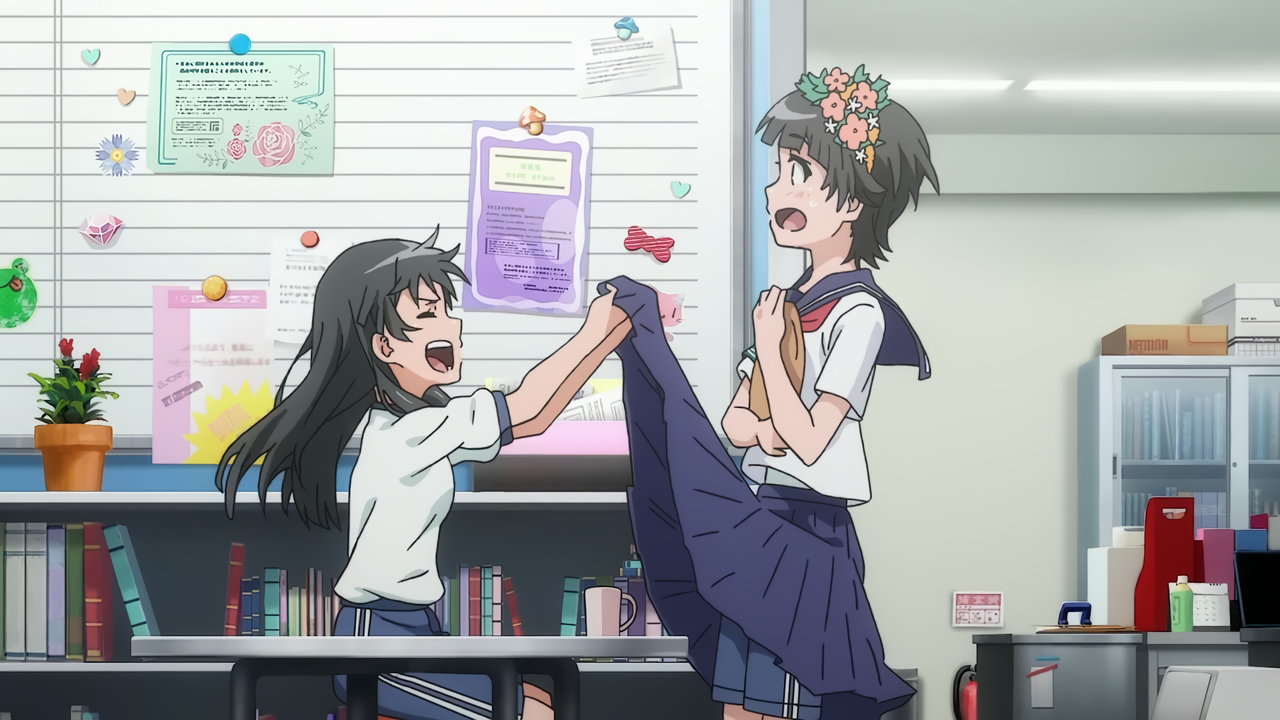 涙子にお約束のスカート捲りされる飾利。しかし毎度ながら、視聴者にはパンツを見せない。