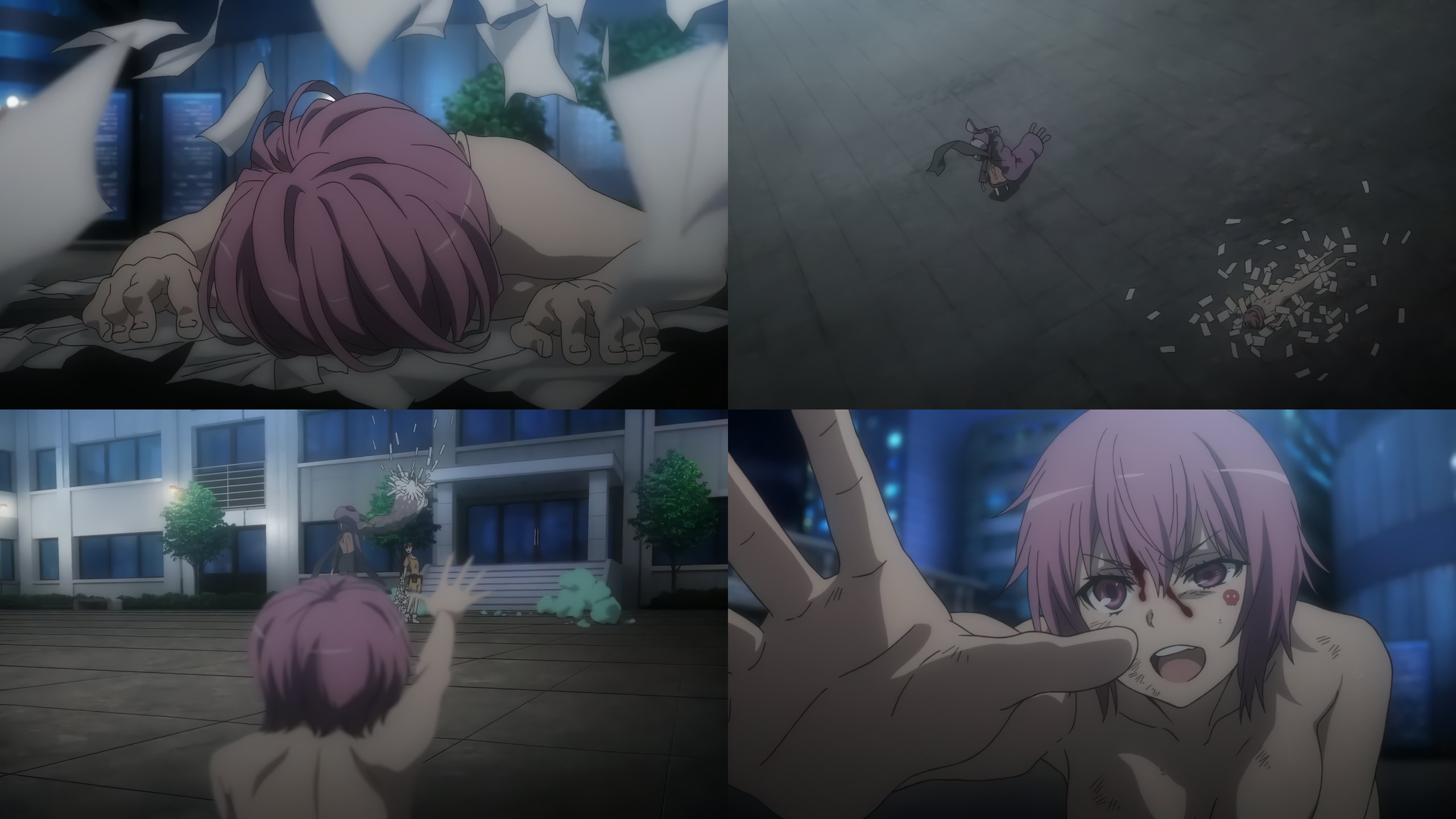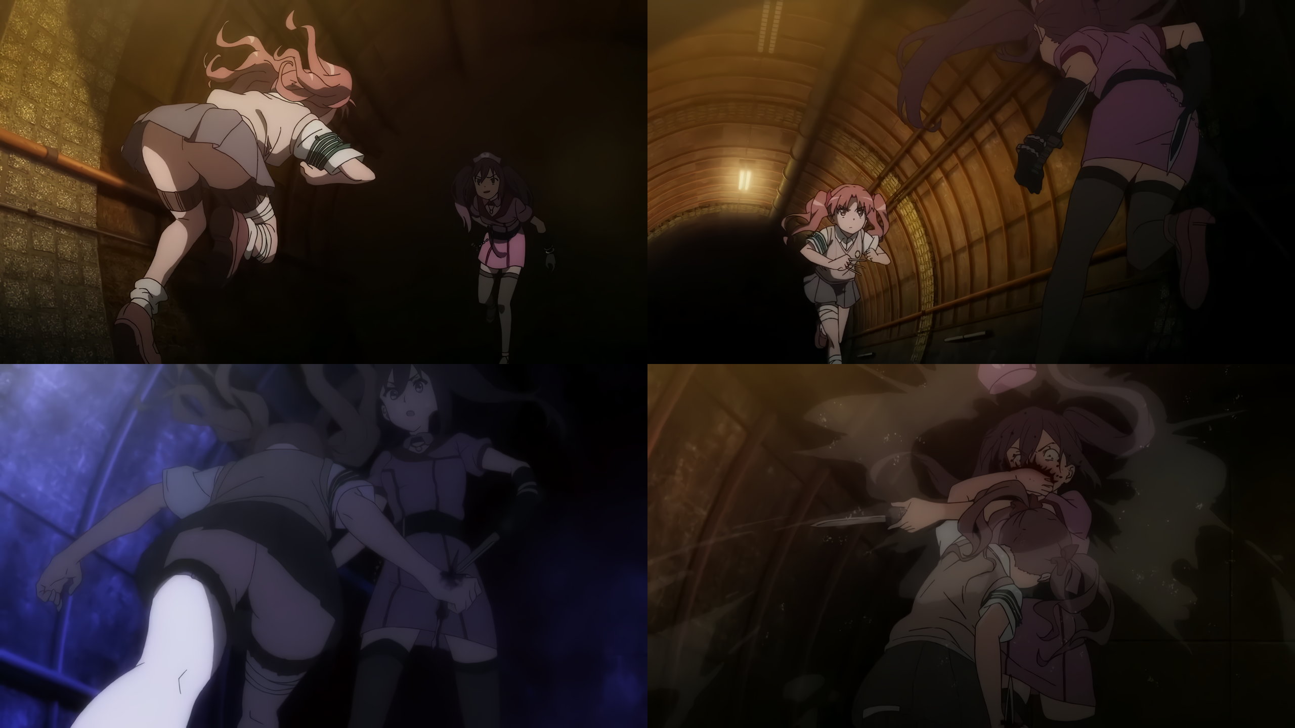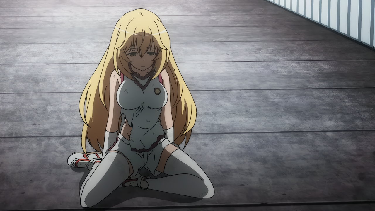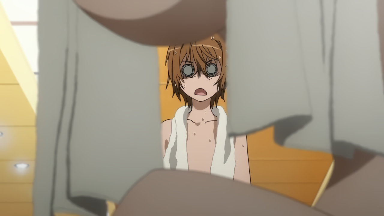 警策看取と戦闘中の黒子。パンチラNG放送規制のためか、パンツ穿いていない状態になってしまっている。