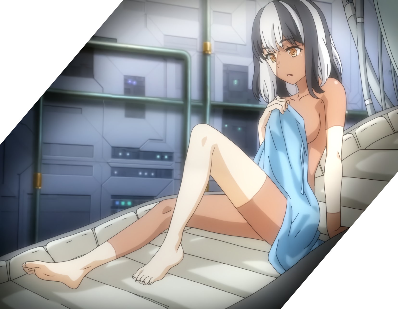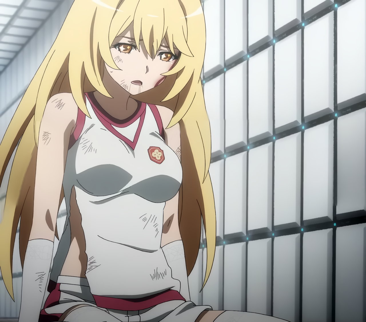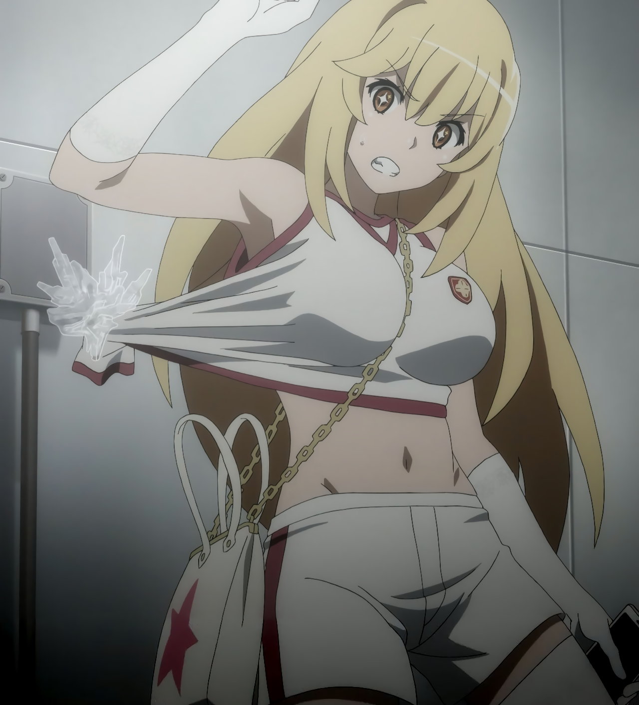 警策看取と戦闘中の黒子。パンチラNG放送規制のためか、パンツ穿いていない状態になってしまっている。