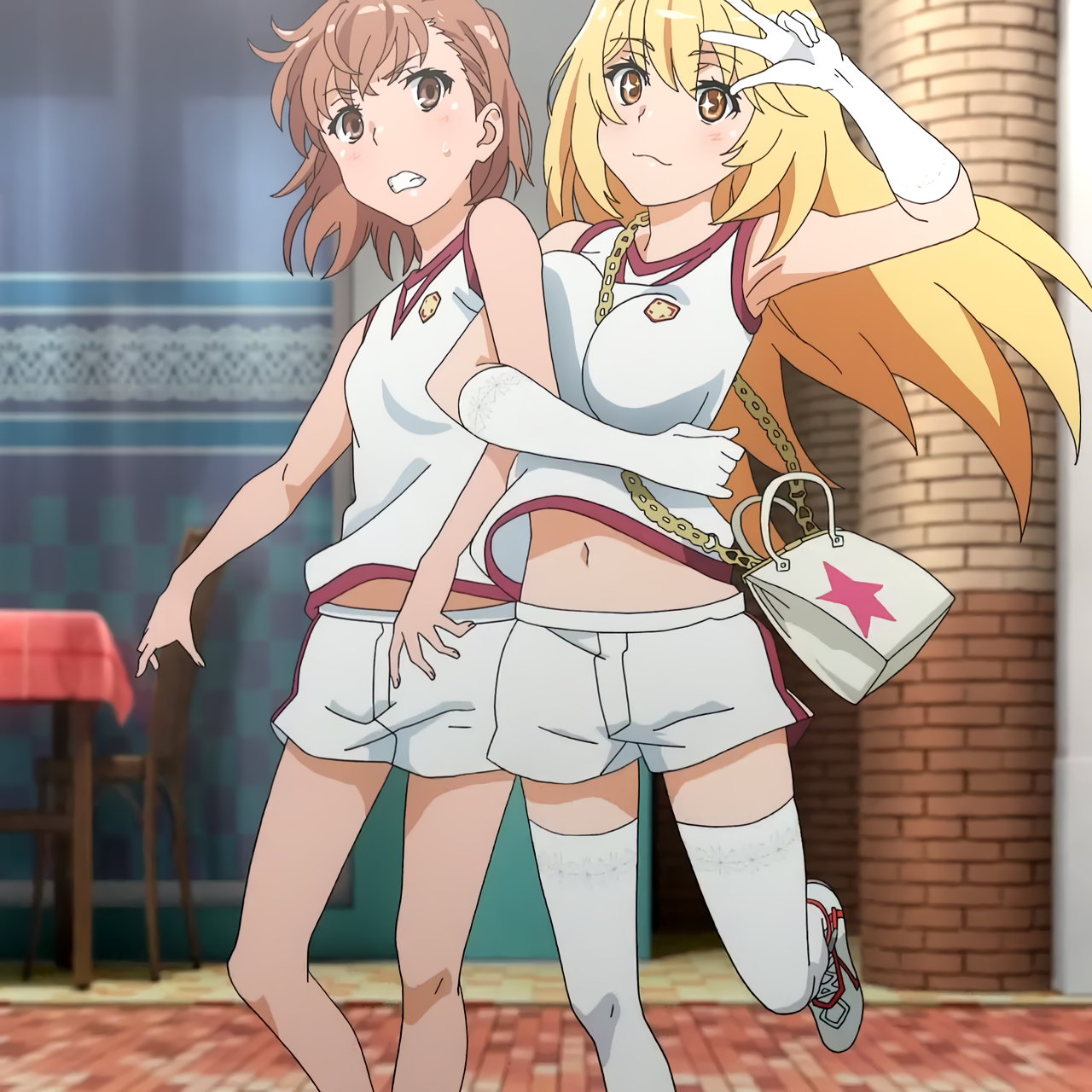 美琴に体操服上着を引っ張られ、下乳が見えそうな操祈。