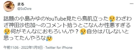 話題の小島みゆのYouTube見たら鳥肌立った泣き顔わざわざ神田沙也加〜のコメント拾うとこなんか性悪すぎる泣き顔何がそんなにおもろいんや?泣き顔自分はバレないと思ってたんやろな