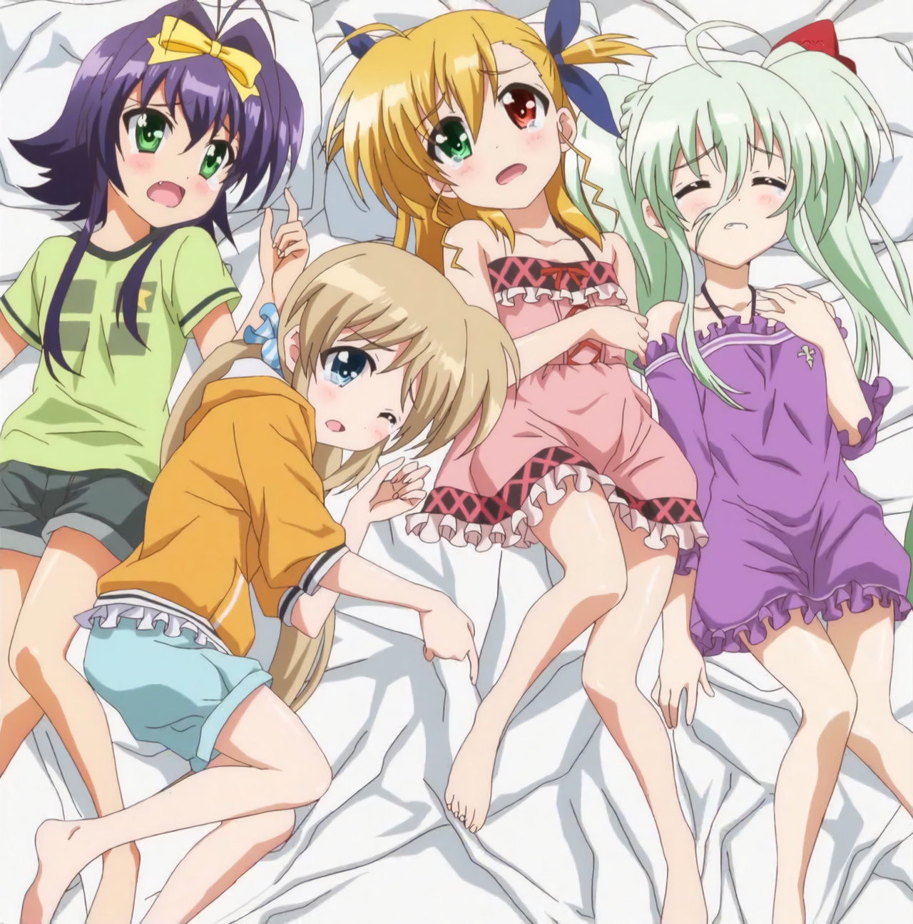 筋肉痛に悶える、寝間着姿のリオ、コロナ、ヴィヴィオ、アインハルト。