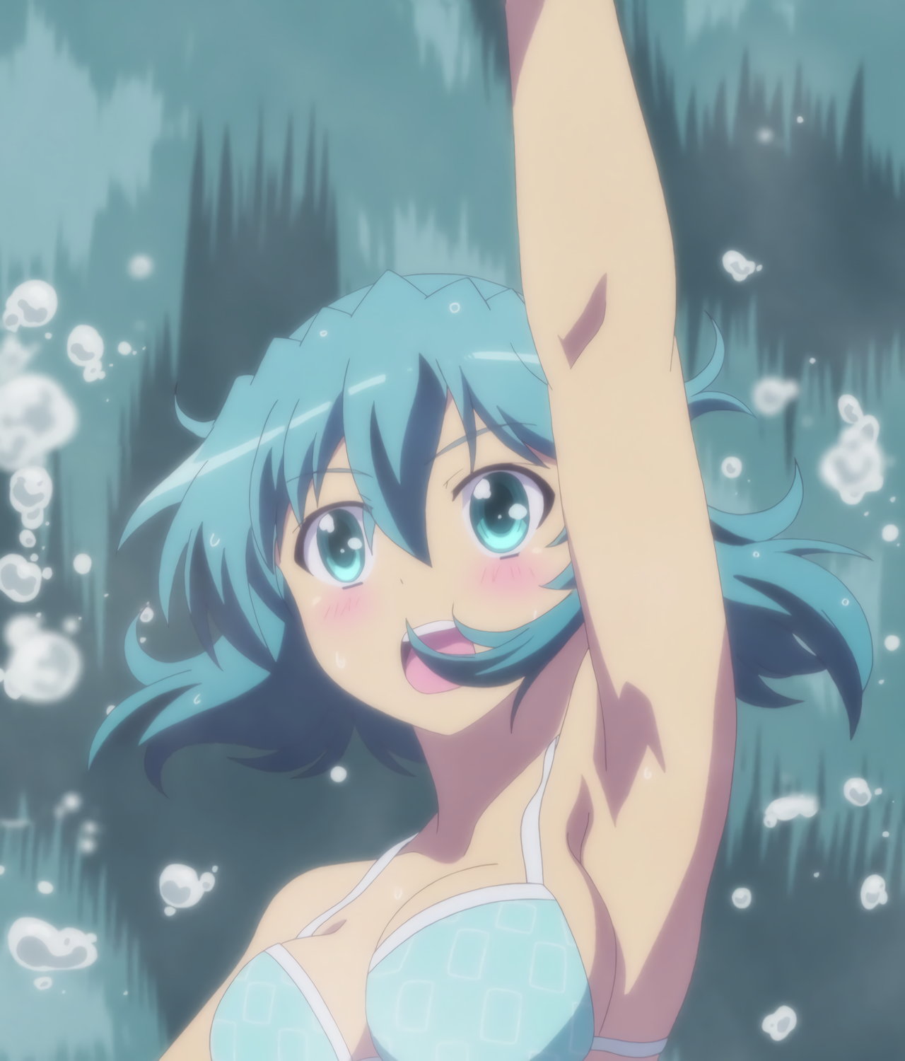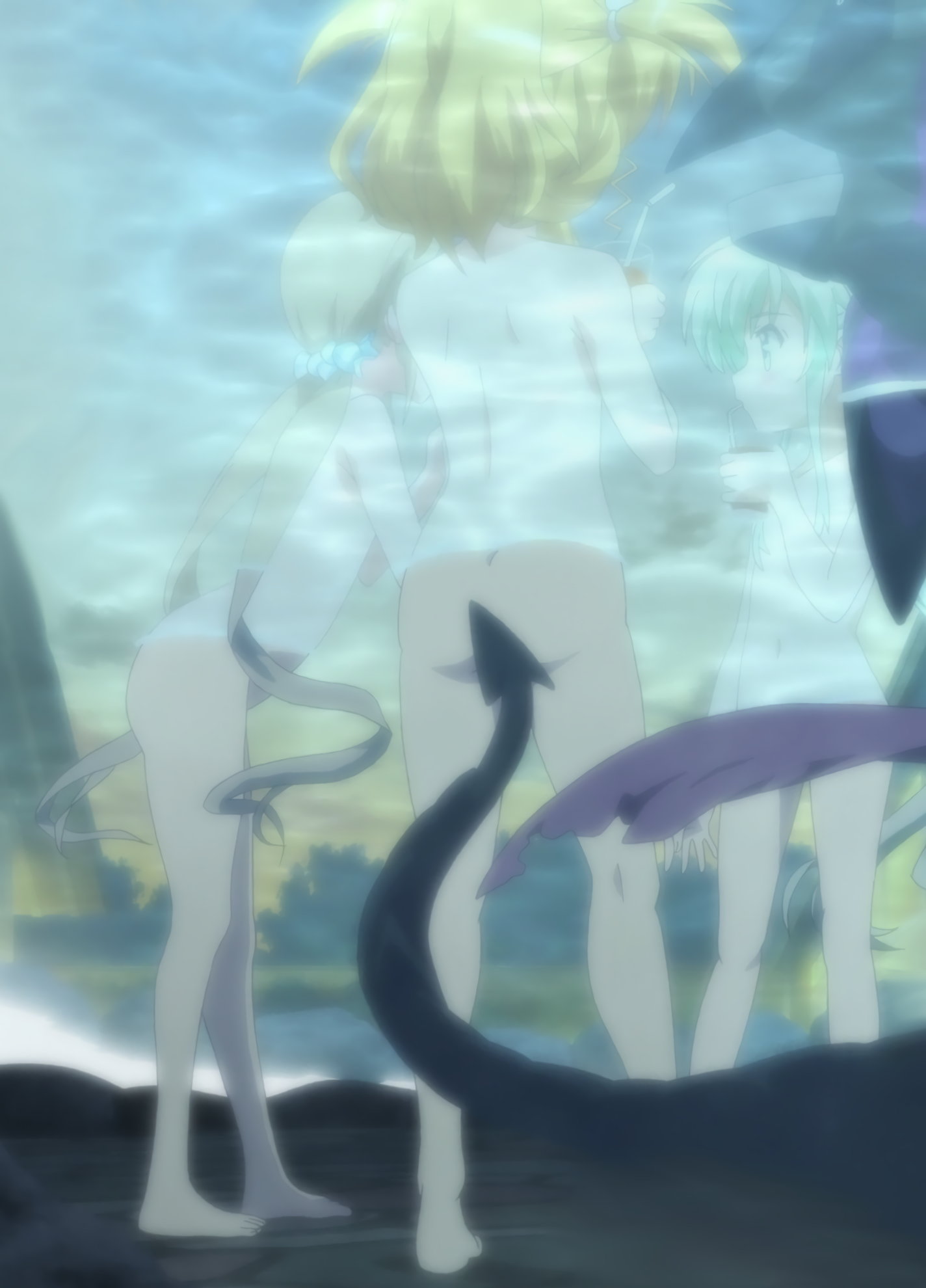 水中に潜む謎生物に体を触られ、悶えるキャロとティアナ。