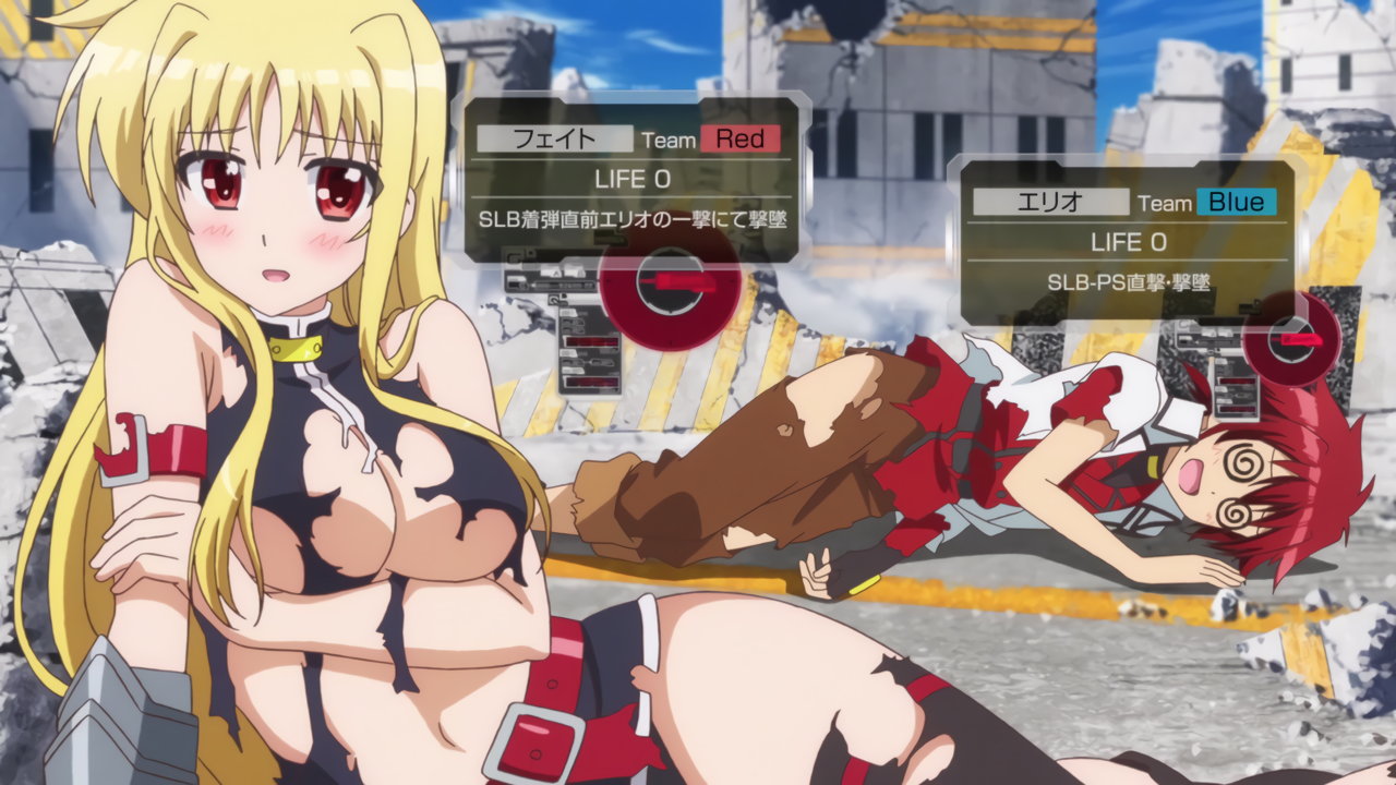 模擬戦にて被弾し戦闘服が破衣状態の、フェイト、エリオ、コロナ、なのは、スバル、ノーヴェ。