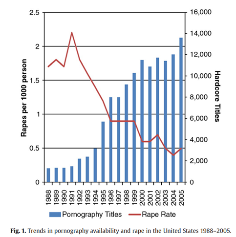 鼻で笑えなかった人のために解説すると、統計上のレイプ件数と(おそらくハードコアな)ポルノのタイトル数を見て「ポルノの数が増えているのにレイプは減っているならポルノに悪影響はないんだ!」と結論してしまったそそっかしい主張だということです。なお、私はこうした主張が誤りである理由を様々なところで散々述べており、感覚としては「5年間家庭教師で教えてきた中学生が分数の割り算を間違えた」のを目の当たりにしたのと同じ感じだと思ってください。