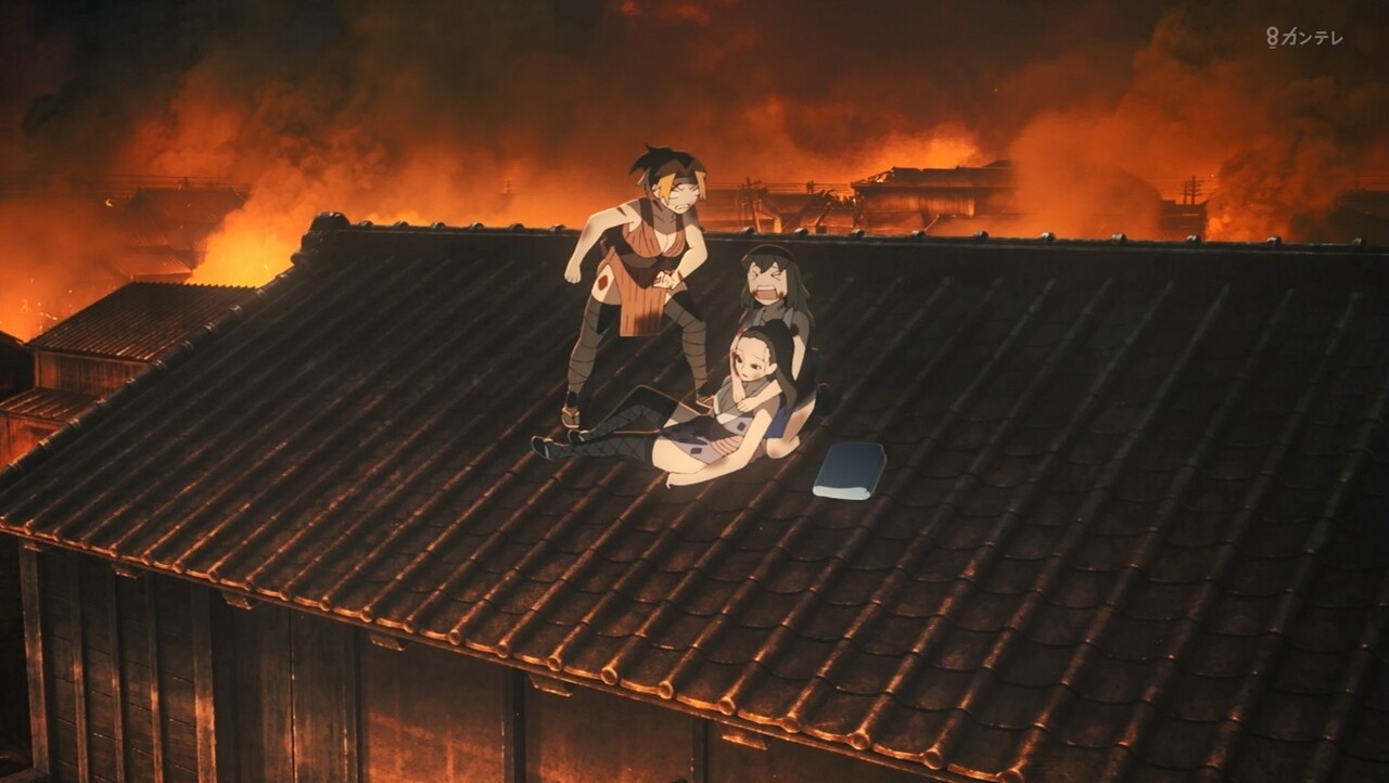 妓夫(このガキ逃げるふりしてこれを取りに行ってやがったな!瓦礫と一緒に遊女の香り袋をばらまいてクナイの毒のにおいを隠した!)