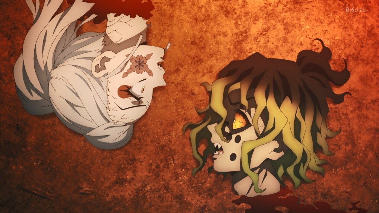 - 頸を斬られた妓夫太郎と堕姫が顔を見合わせる場面