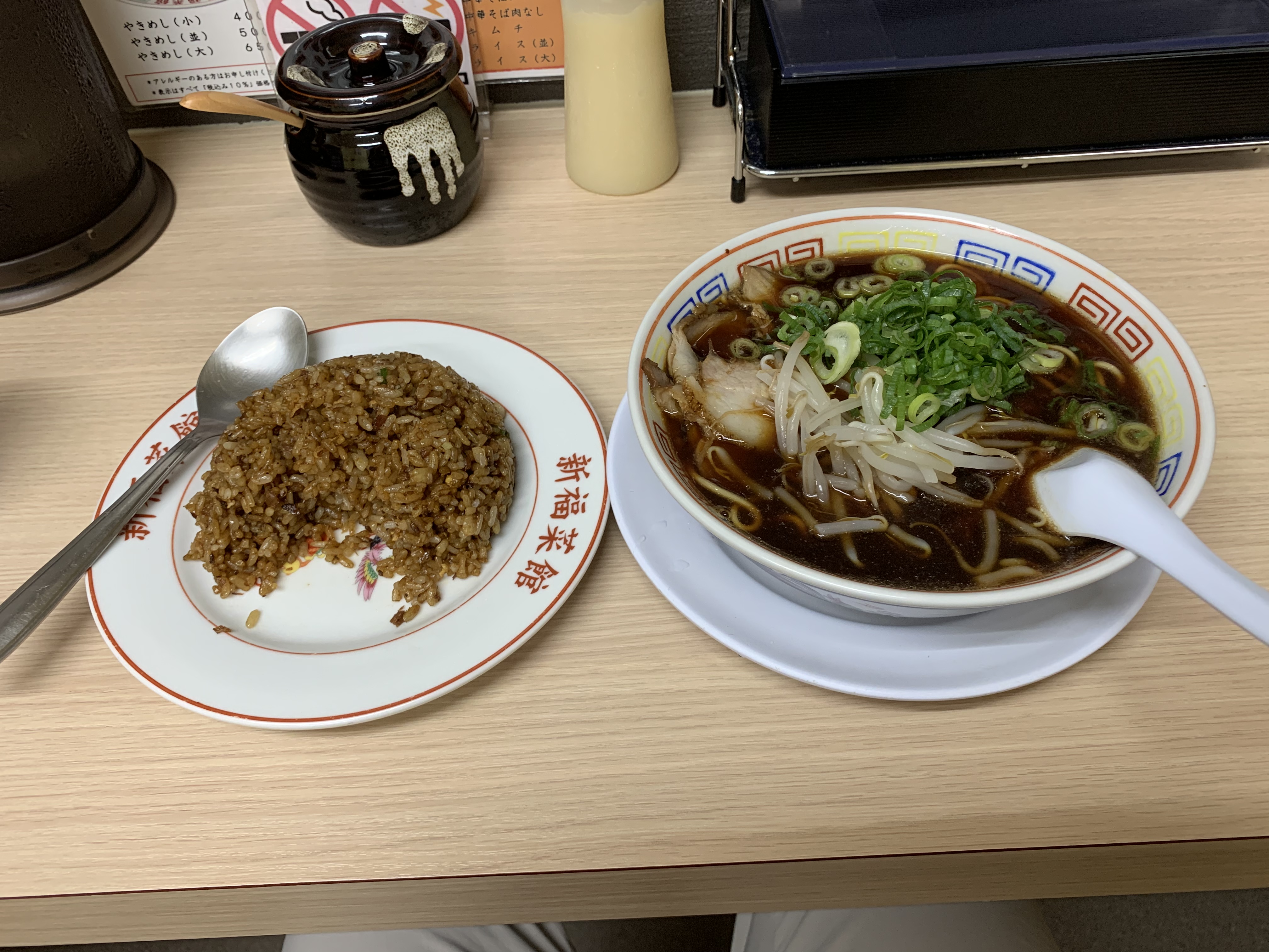 新福菜館府立医大前店。本店より若干固めであったが、これはこれでおいしかった。なお発熱しているかどうかは知らないが、特に体感として変化はない。無性にラーメンが食べたくなったぐらいである。