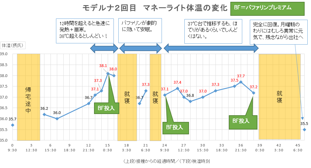 この日は、日中37℃近辺をうろうろとし、なかなか熱は下がらなかったが、バファリンプレミアムのおかげなのか、ほてりと腕の痛み以外の異常初見はなかった。