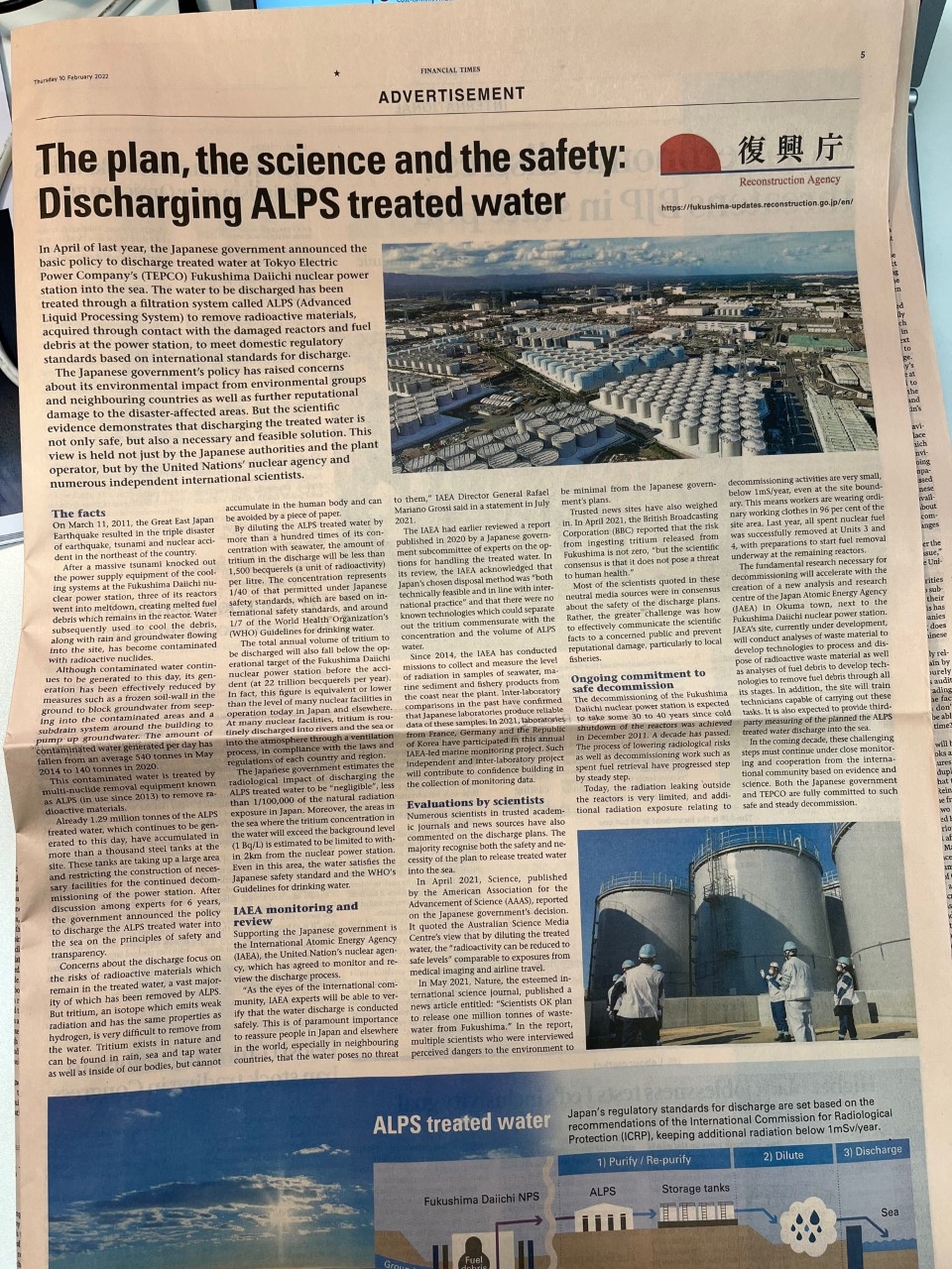 復興庁が処理水の安全性をPRする広告を世界中のフィナンシャル・タイムズに出した。1ページをまるまる使った詳細な中身。こういう攻めの発信をどんどんやるべき。