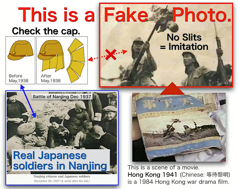 補足。 This Photograph is fake. 説明に付け加えると、この写真に映る日本兵は夏の兵装です。南京攻防戦は真冬の出来事です。