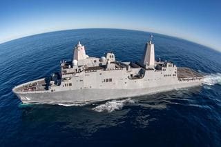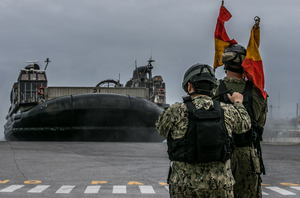 米国の強襲揚陸艦「キアサージ」へ海兵隊の訓練用資材を運ぶホバークラフト(1月19日、米海兵隊のサイトより)
