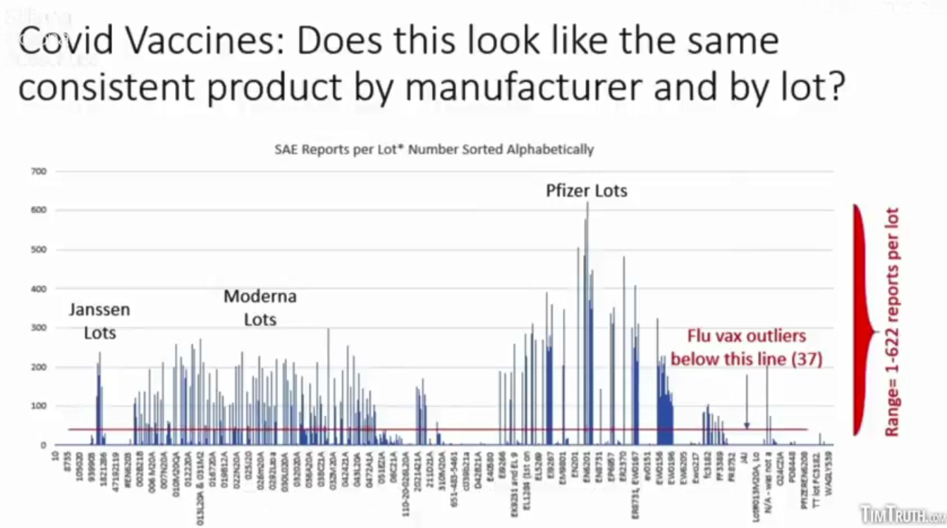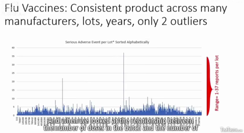 「チーム・エニグマ」と呼ばれる独立した研究者が、VAERSデータベースの独自の分析を行っていました。彼らが行っていたのは、ワクチンのバッチ番号やロット番号を抜き出し、同じメーカーの各ロット番号の有害事象を比較することでした。彼らが期待したのは、全州、全ロットにわたって有害事象が散見されることでした。しかし、それは見つかりませんでした。この人は、有害事象の90パーセントがロットの10パーセント以下と関連していることを発見しました。