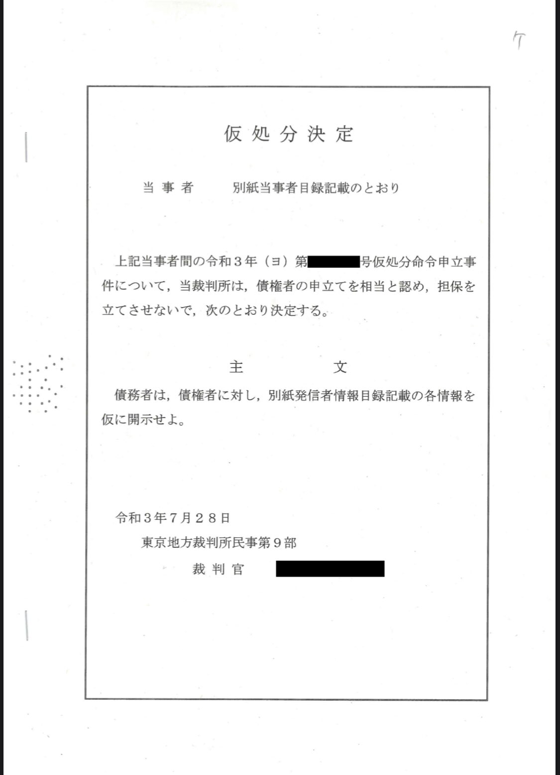 過日、東京地裁において Twitter 社代理人との双方審尋期日を行い、裁判所に申立てを行った全アカウントについて仮処分決定が出されました。8月上旬には Twitter 社から IP アドレス等が開示され、今後開示請求訴訟を提起する予定ですが、謝罪と投稿削除を前提に示談も検討致します。