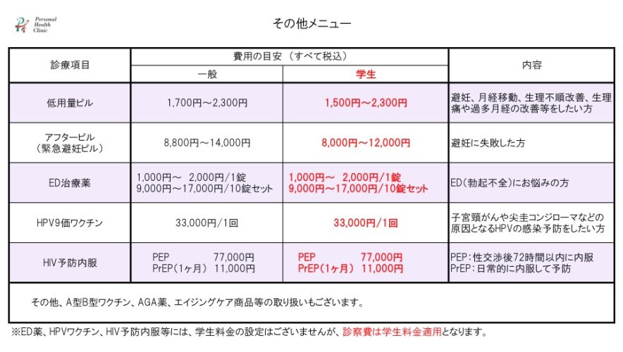ピル、ED薬、HPVワクチン、HIV予防薬(PEP/PrEP)、A型B型肝炎ワクチン、AGA薬等の取り扱いもございます。