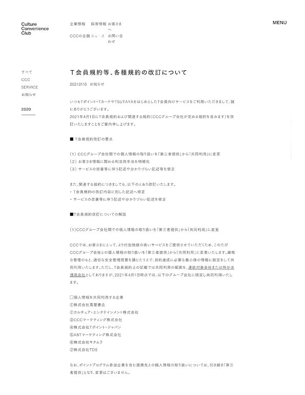 T会員規約等、各種規約の改訂について|ニュース|CCC カルチュア・コンビニエンス・クラブ株式会社 (CCCグループ会社間での個人情報の取り扱いを「第三者提供」から「共同利用」に変更等)