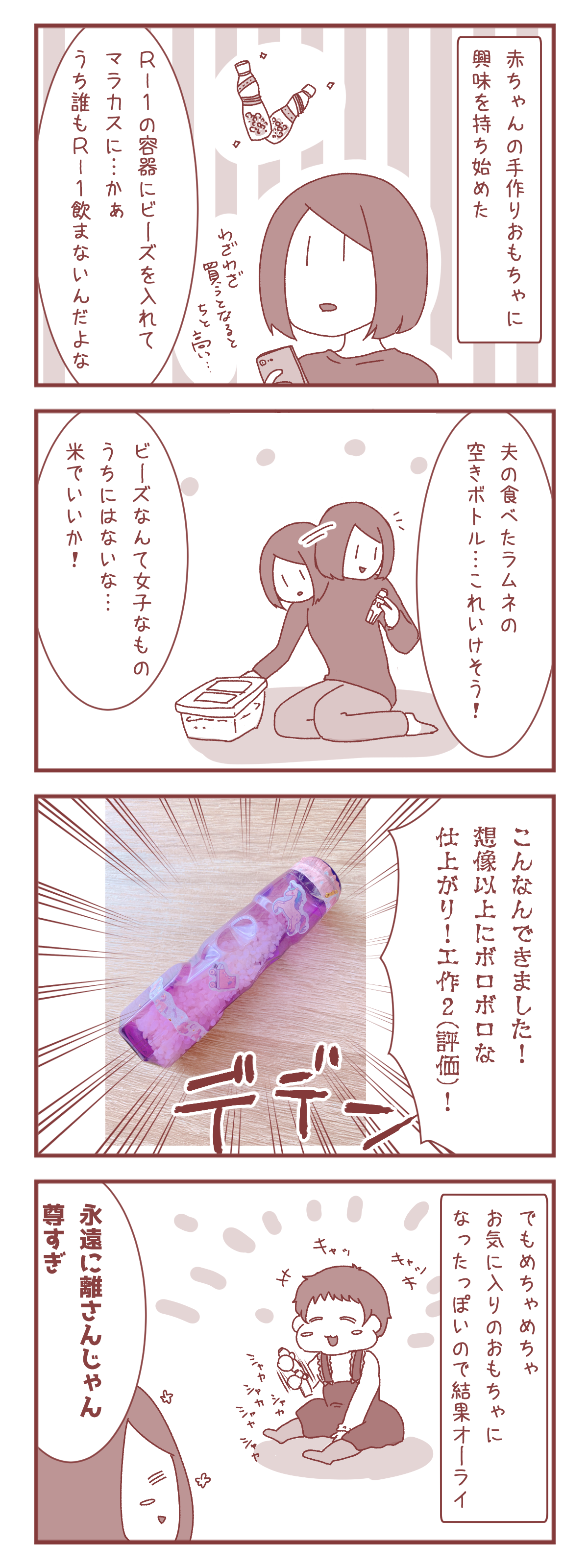 幼稚園児でももうちょっとマシなもん作るやろと言いたくなるような出来ですが、娘ちゃん本人はめちゃめちゃ気に入って、ずっと握って振ってるので、おもちゃとしては大正解なんだと思います。