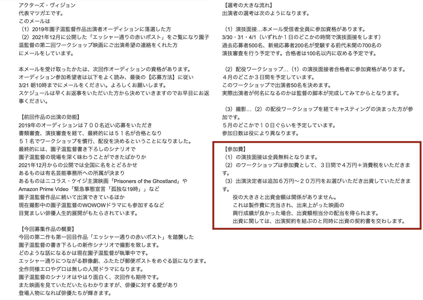 ・園子音監督の次回作オーディションの案内によると、演技面接合格者が参加できるワークショップの参加費が4万円、さらに「出演決定者は追加6万円~20万円をお選びいただき出資していただきます」と記されている