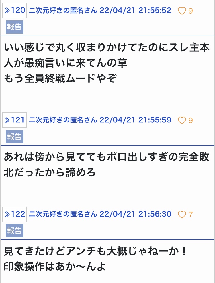アンチくん敗走してこっちで愚痴ってんの……