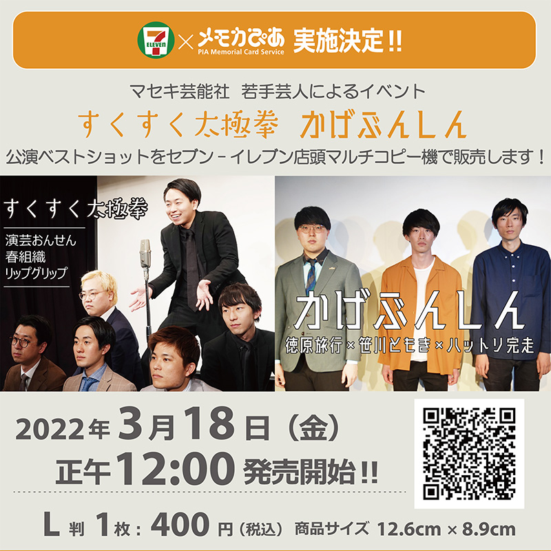 2022年2月21日と22日に開催されたスリーマンライブ「すくすく太極拳」「かげぶんしん」を記念しまして、マセキ芸能社ライブ公式グッズメモリアルフォトカードが誕生しました。