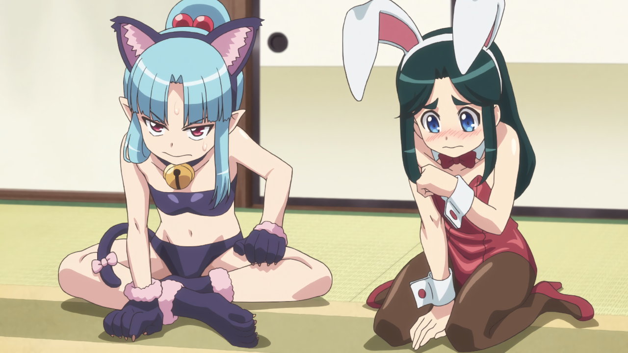 猫スーツ姿の桐葉。バニーガール姿のくくり。