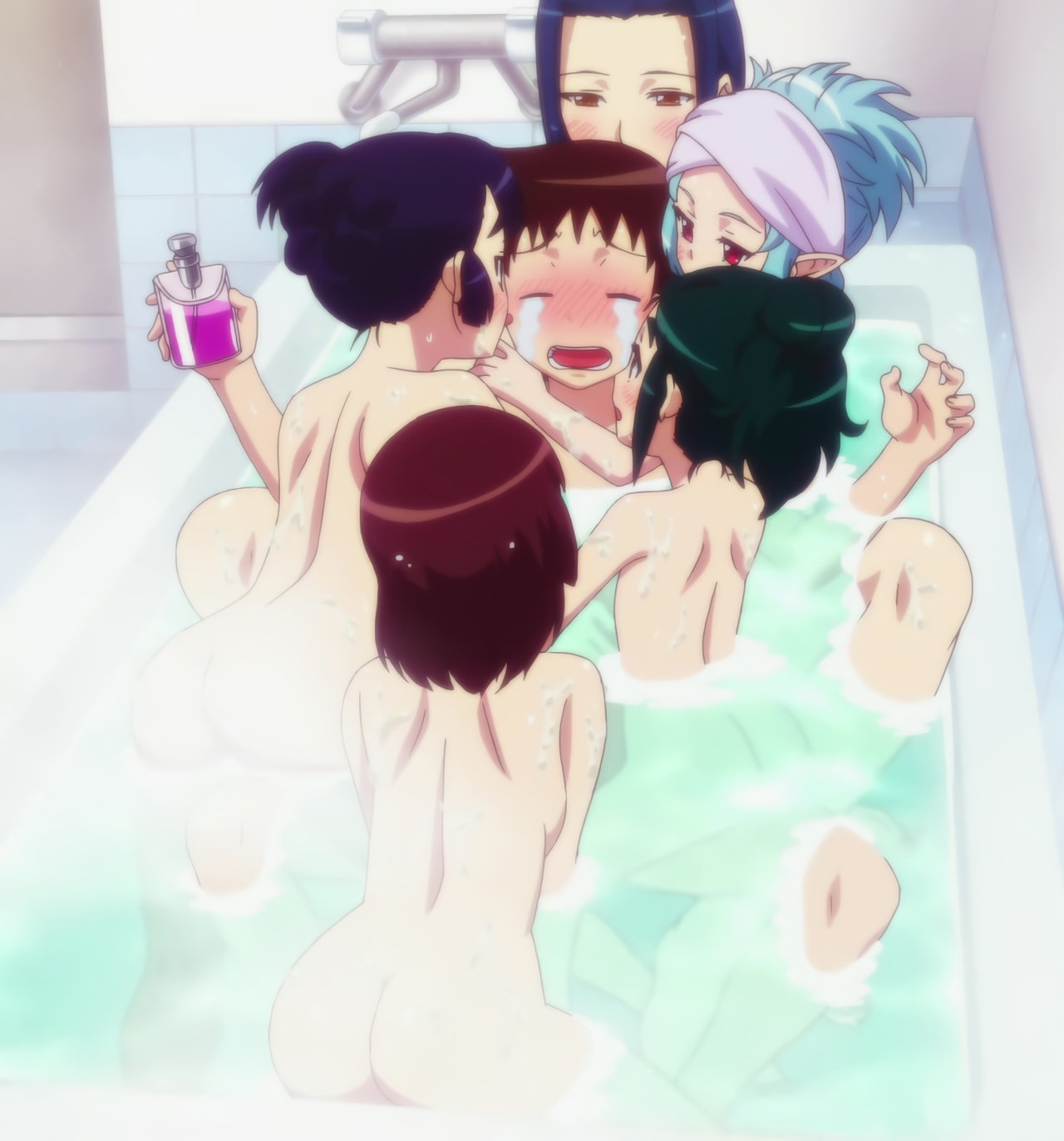入浴中・全裸女子に囲まれ、風呂ハーレム状態の一也。