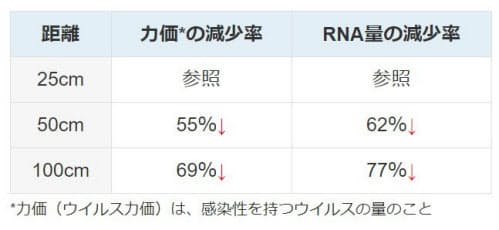 結果:距離が離れるにつれて吸入ウイルス量は減少しましたが、100cm離れていても感染性を持つウイルスの吸入は起こっていました。