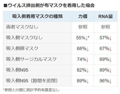 結果:排出側(感染者)がマスクを着用すると、綿マスクであってもウイルスの吸入を有意に減らせることが明らかになりました。